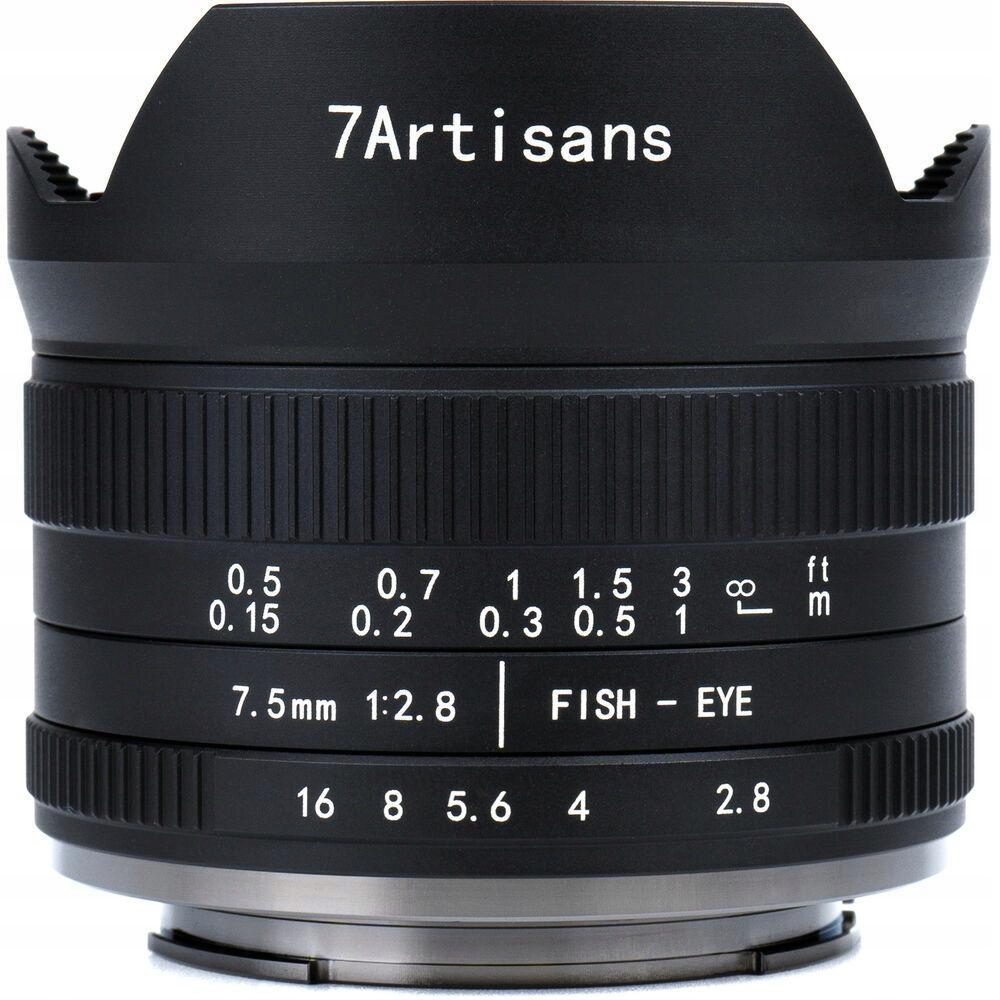 Основні особливості: • Кріплення: • Діапазон діафрагми: f/2,8 до f/22 • Вага: 265 г • багатошарове покриття об'єктива • Кут перегляду 190 ° • Ручне фокусування • Мінімальна відстань фокусування: 15 см • 7- діафрагма Ламела • Побудований -тюльпан Сонцева кришка 7artisans 7,5 мм f/2.8 II -це тип лінз Рибне око з кутом огляду 190 °. Це ручний об'єктив, здатний створити виняткові перспективи та творчі спотворення. Максимальна діафрагма об'єктива f/2.8 є оптимальною, коли мова йде про роботу в різних умовах освітлення, зберігаючи невеликий і легкий корпус для фотографування з руки. Оптимізована оптична структура (11 елементів у 9-х гапах) характеризується більш високим коефіцієнтом краху світла та зменшенням хроматичного покриття завдяки використанню скляних лінз Hoya ED.
