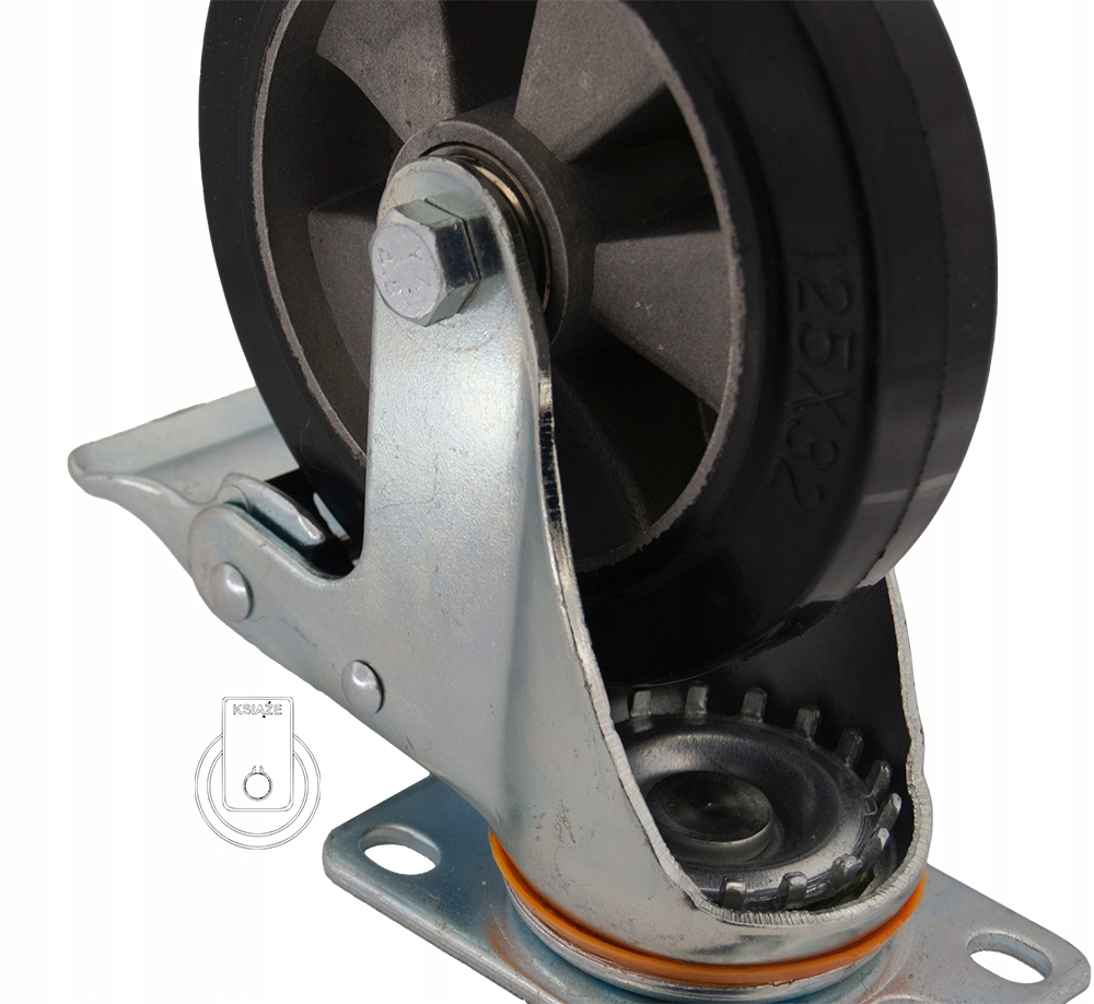 - Корпус Виготовлені сталеві листи з високою довжиною. Плитка має розміри 95x65x3 мм. Колеса мають діаметр 125 мм, а центри кріплення мають розмір 75 х 45 мм і овальні отвори для кріплення розміром 12 х 8,5 мм. Загальна висота - 157 мм + 125 мм. Колеса мають міцність 150 кг на колесо. Вони використовуються повільно, вони стійкі до пошкодження, поглинання ударів та вібрацій. Вони обертають 360 градусів, полегшуючи маневрування меблями або коляскою. Вони плавно обертаються на твердих і гладких поверхнях, як бетон з дуже маленьким тертям.
