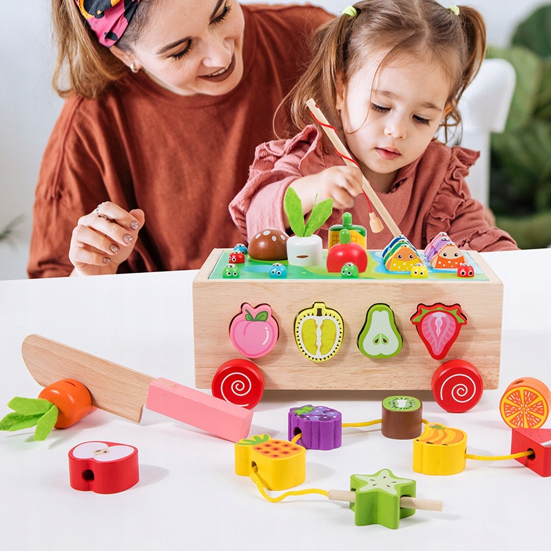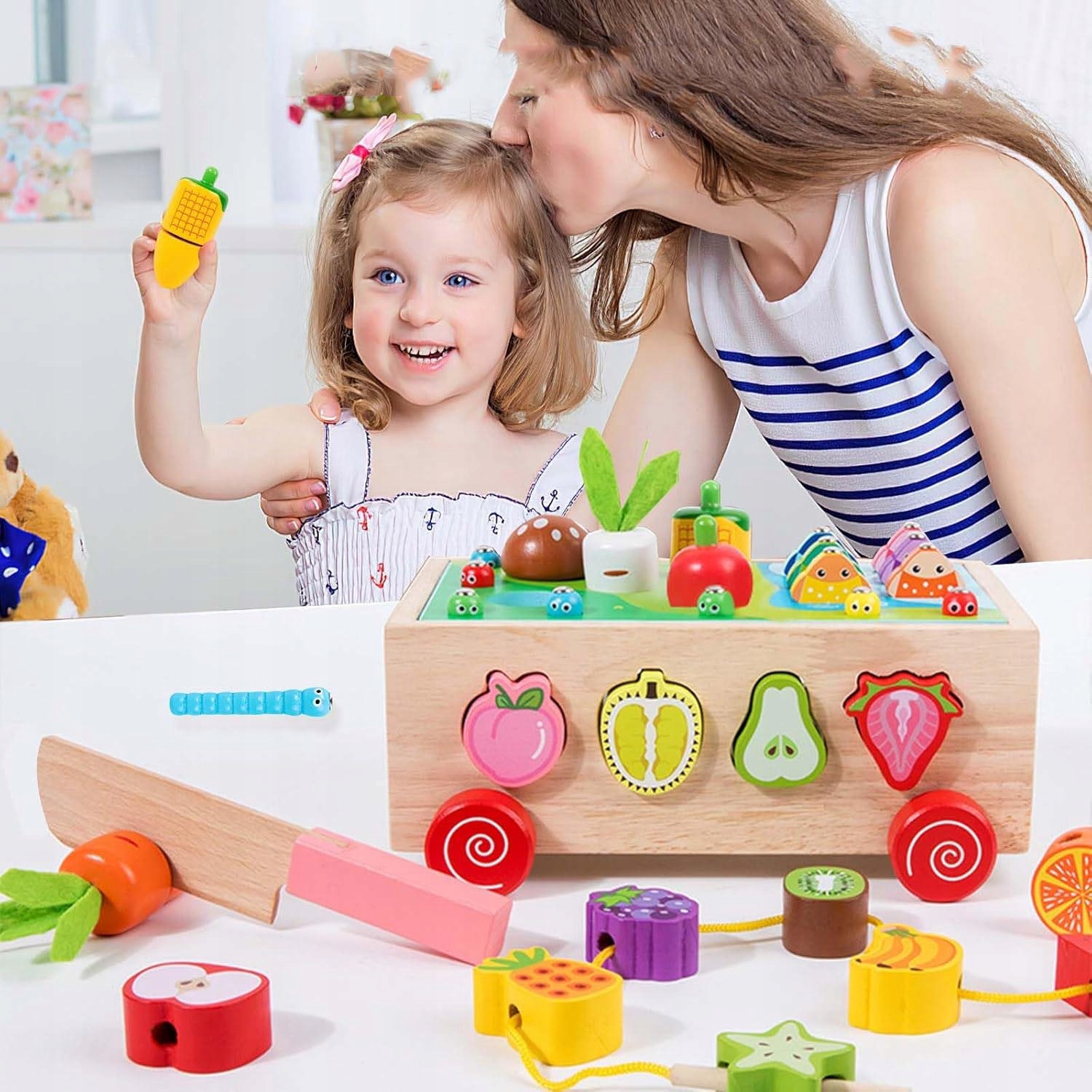 високоякісні дерев’яні іграшки включають 12 фруктових блоків, 8 моркв, 10 чарівних глистів та п’ять кошиків різних форм і структур. Більше того, дерев’яна іграшка має великі частинки, відшліфовані краї та нетоксична фарба, заснована на воді, задовольняючи як потребу дитини в навчанні, так і бажання батьків щодо безпеки та якості.