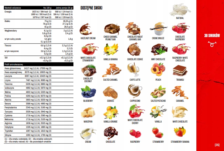- 27,3 г білка на порцію 35 г (у сухій речовині);