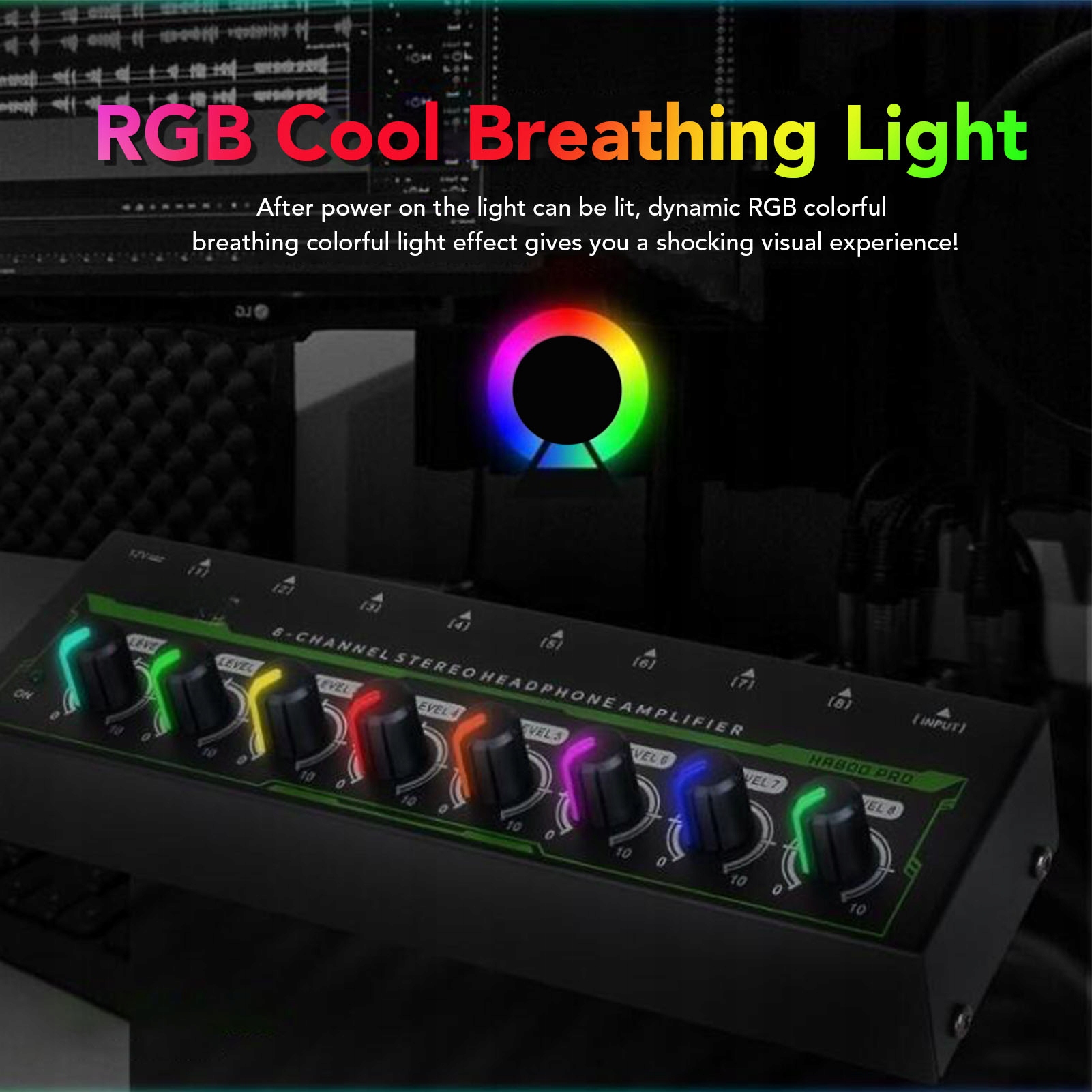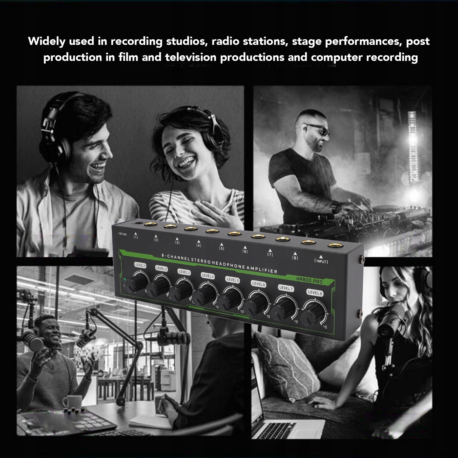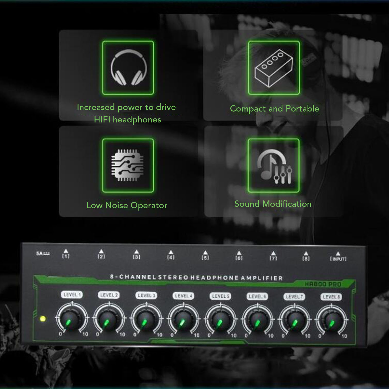1. 8 каналів підсилювач: у 8 схем підсилювача цей підсилювач навушників дозволяє одночасно підключитися до восьми навушників або студійних пристроїв, ідеально підходить для любителів музики, які шукають високоякісного звуку.