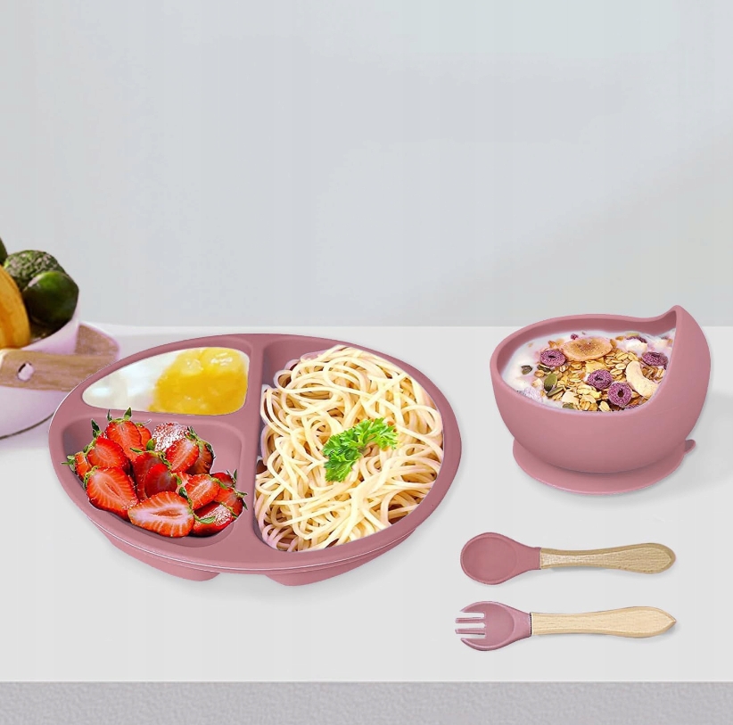 ✅-✅-2 силіконові вилки, 2 силіконові ложки, силіконова сальвція, силіконова тарілка, силіконова миска та силіконова чашка для пиття. Кожен елемент виготовлений з високоякісного силікону, затвердженого для контакту з їжею, і не містить BPA.