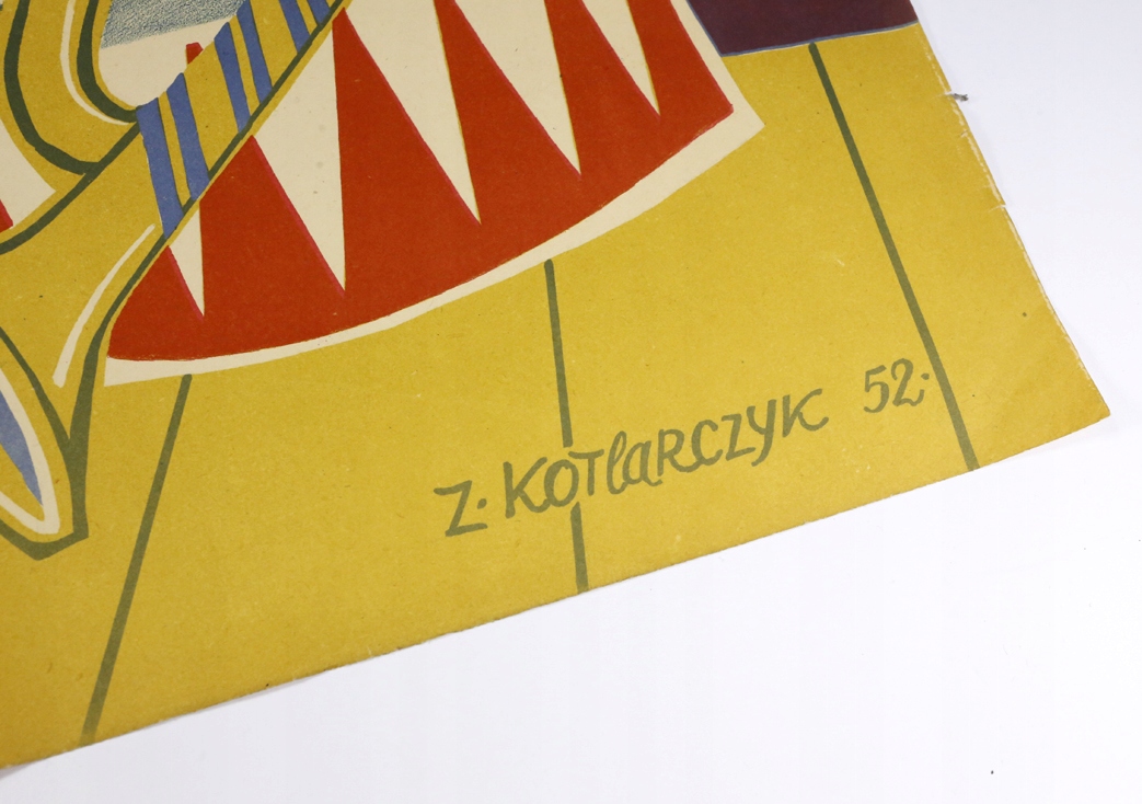 Оригінальний надзвичайно рідкісний польський плакат, Театр Baj Pomorski, 8 ляльок і 1 плюшевий ведмедик, офсетний друк, 1952, Зигмунт Котларчик, розмір: 69 x 49 см, дуже хороший стан - мінімальні пошкодження місцями, особливо по краях. Зигмунт Котлярчик (Харків 1917 - 1996 Торунь) жив із сім'єю в Ґрудзьондз у 1924-1936 роках. Вивчав мистецтво в Академії образотворчих мистецтв у Вільнюсі, а після війни продовжив навчання на факультеті образотворчого мистецтва Університету Миколи Коперника в Торуні під керівництвом проф. Тимон Несьоловський та проф. Едвард Кучинський. Був членом Торуньського відділу ZPAP та мистецької формації «Grupa Toruńska». Надзвичайно цікавий оригінальний предмет. Стан добре видно на фото в описі аукціону.