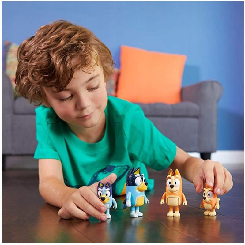 Включно з усіма чотирма членами сім’ї Блуі: Блюі, Бінго, Бандитом (тато) і Чілі (мама) . Додайте 4 друзів Блуї та Бінго: Коко, Снікерс, Расті та Маффін. Є багато наборів іграшок та аксесуарів, які збагатять світ Bluey's.