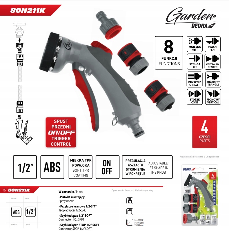 Набір із чотирьох частин для створення систем поливу. Він складається з 8-функціонального розпилювача з регульованою інтенсивністю потоку води на задній ручці. На додаток до 8 форм водяного потоку (від висококонцентрованого потоку до делікатного туману), він також має функцію ввімкнення/вимкнення тригера на передньому курку. Це дозволяє керувати пістолетом однією рукою. Регулювання потоку води регулюється клапаном у верхній частині пістолета, також є можливість заблокувати курок, щоб не втомлювати руки. Корпус пістолета-розпилювача виготовлений із комбінації міцного ABS-матеріалу та вставок із м’якого матеріалу TPR, що забезпечує ідеальне зчеплення навіть із вологою поверхнею. У набір входить 3/4" кран з'єднання зі зменшенням до 1/2", 1/2" прохідний швидкий з'єднувач і другий 1/2" STOP швидкий з'єднувач, що дозволяє від'єднати робочі кінці без необхідності закрийте водопровідний кран.