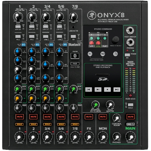 Аналоговий мікшер з USB-портом — це найкраще компактне та доступне рішення для живої гри, домашнього запису або створення контенту. Мікшер Onyx 8 оснащений: 8 каналами, включаючи 4 канали мікрофона з легендарними мікрофонними попередніми підсилювачами Onyx Mic, які забезпечують посилення до 60 дБ, функціями багатоканального запису одночасно у високій роздільній здатності 24 біта/96 кГц через USB 8x4 I/O. на Mac/PC, потужний процесор DSP з редагованими параметрами ефектів і можливістю збереження власних пресетів, програвач і рекордер SD-карт - 96 кГц / 24-біт 2x2, чіткий кольоровий дисплей, вбудований модуль Bluetooth для прямого відтворення музики на каналах 7/8, Aux посил: 1 + FX, глобальне фантомне живлення 48 В, фільтр високих частот 100 Гц на мікрофонних каналах 1-4, перемикач Hi-Z на каналах 1-2, що забезпечує безпечне підключення безпосередньо до гітари або басу мікшер і 3-смуговий корекційний еквалайзер Perkins "British style" з опцією увімкнення/вимкнення та параметричним Mid Freq. Розміри: 279 x 267 x 115 мм (ДхШхВ). Вага: 3,2 кг.