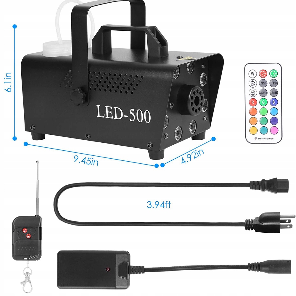 У набір входять два пульти дистанційного керування - один для контролю кількості диму, а інший для регулювання кольору світла, - які можна використовувати окремо або в комбінації, що робить їх зручним рішенням для таких заходів, як вечірки, концерти та театральні вистави.