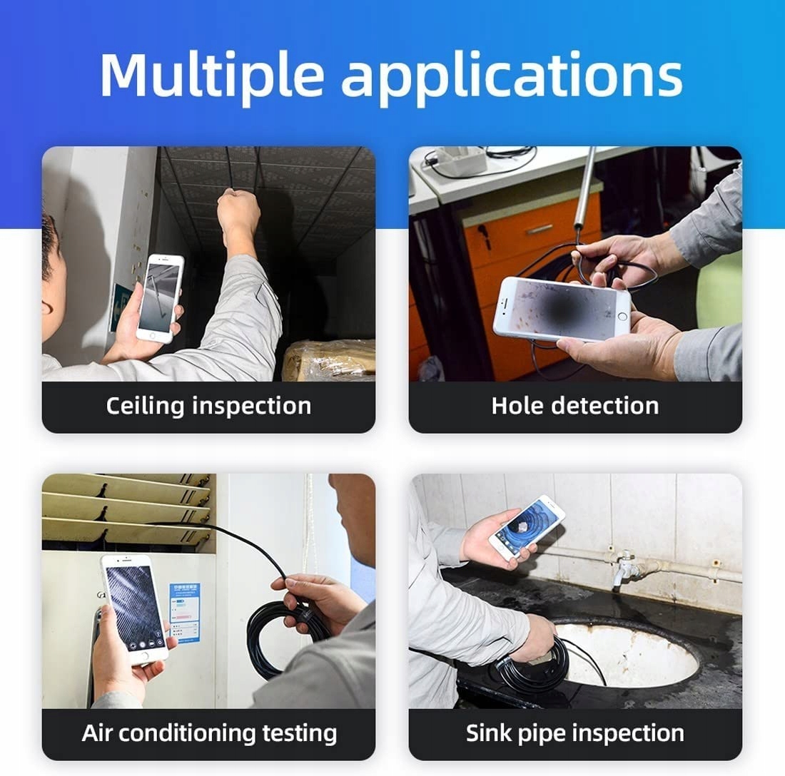 Оглядові камери з подвійним об’єктивом. Ця бездротова ендоскопічна камера оснащена камерою високої роздільної здатності 1080P для перевірки фокусного діапазону 70 спереду та 70 збоку, щоб забезпечити загальний кут огляду 140. Лише 8-мм об’єктивЦей бездротовий датчик камери лише 8 мм в діаметрі. Дріт гнучкий, але добре тримає форму, тож ви можете маневрувати камерою крізь отвори та над головою в місця повзання. Регульовані світлодіодні ліхтарі. Ця камера-бороскоп із 6 надяскравими світлодіодними лампочками, які забезпечують достатньо світла в темряві. Усі наші світлодіодні лампи та ліхтарі для камер є водонепроникними. Підходить для різних типів середовищ, таких як слабке освітлення або темрява, волога чи волога зона тощо. Широка сумісність Цей бороскоп підключається до пристроїв Android та iOS через з’єднання Wi-Fi із безкоштовною програмою, яку можна завантажити для вашої зручності. Підтримує більшість смартфонів або планшетів Android і пристроїв iOS на ринку. Аксесуари в комплекті У набір входять три корисні аксесуари для кріплення до камери, включаючи бічне дзеркало, магніт і гачок. Дивіться предмети з найтемніших місць, наприклад зливного кільця або гвинта впускного колектора.