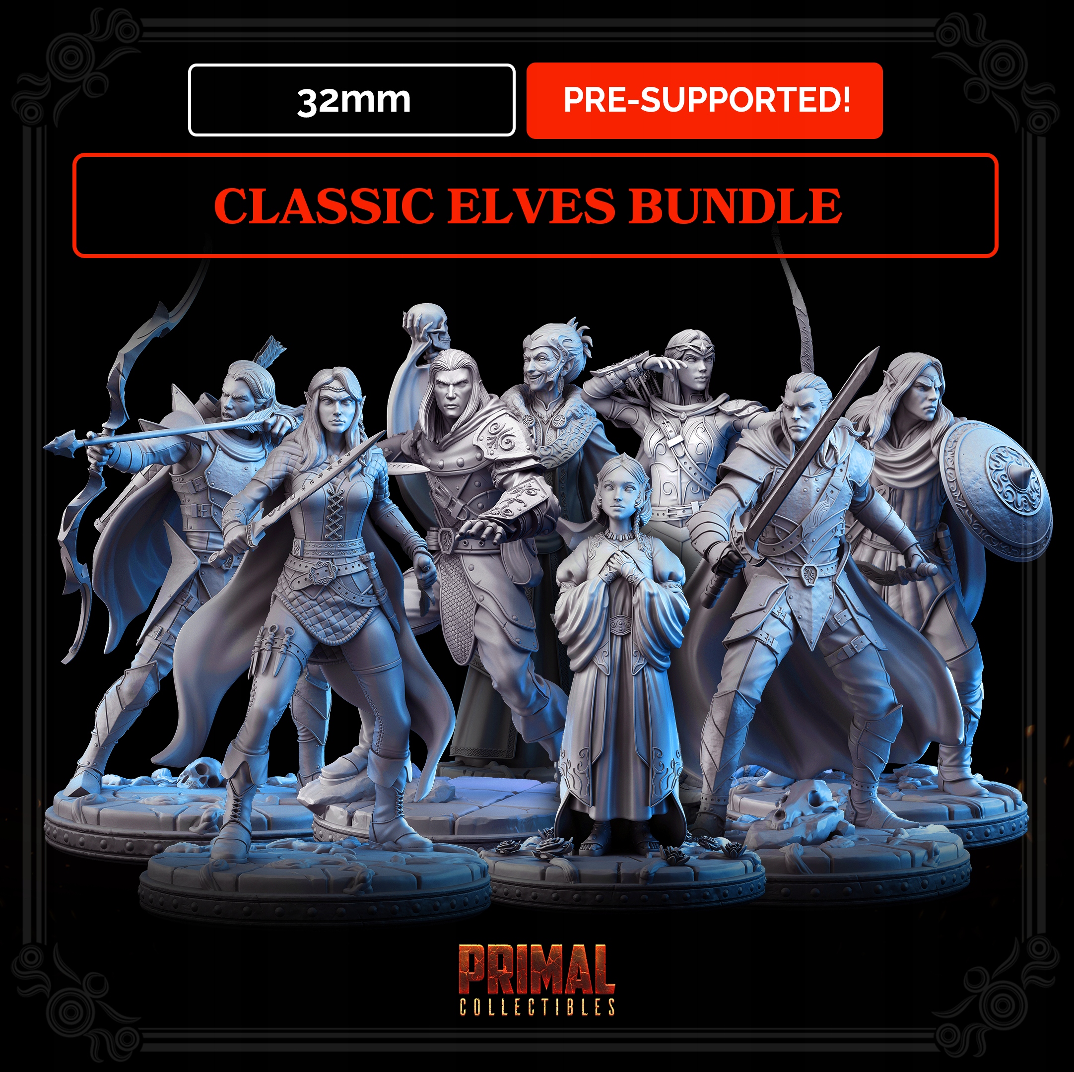 Тема продажу - це набір моделей 8 мініатюрних класичних RPG Elves Bundle Masters of Dungeons Quest від Primal Collectiple.