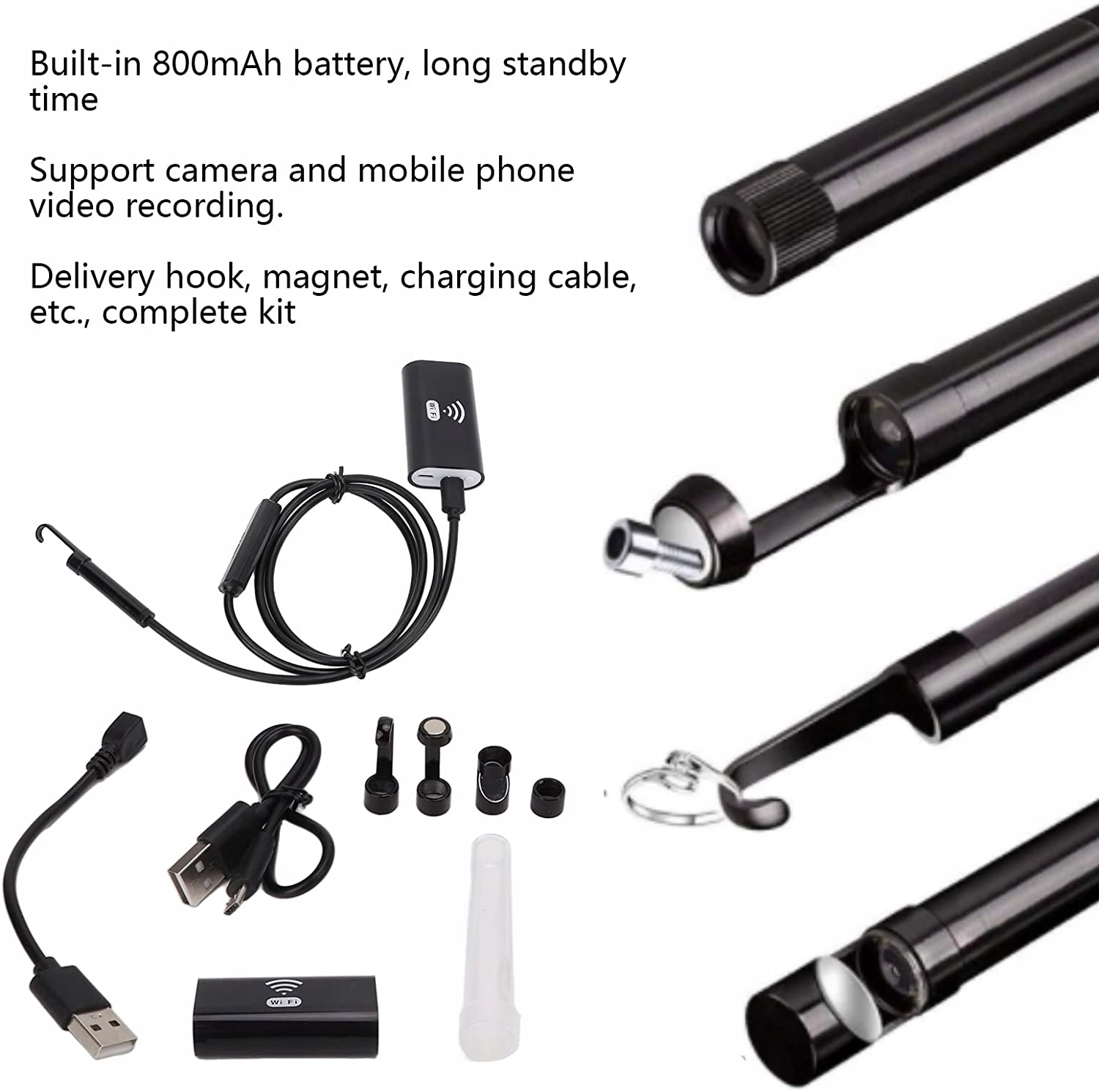 Телефонний ендоскоп Wi-Fi. Ендоскоп оснащений Wi-Fi і сумісний з багатьма мобільними телефонами одночасно. Вам не потрібно використовувати смартфон для підключення до Wi-Fi і вам не потрібно завантажувати будь-які драйвери. Регульована яскравість Регульовані рівні яскравості, щоб забезпечити достатньо світла для темних ситуацій. Ручка регулювання яскравості світлодіодів покращує видимість у темних місцях, створює чітке та яскраве зображення, адаптується до різноманітних умов. ВИСОКА ЯКІСТЬ Об’єктив із високою роздільною здатністю 1200p із технологією Bluray покращує чіткість зображення для отримання чіткого зображення незалежно від загального контролю чи деталізації. Вирішіть проблему чіткіше та ефективніше. Довговічний вбудований акумулятор на 800 мАг, супер довго в режимі очікування, працює завдяки зарядці 5 В, підтримує камеру та відеозйомку мобільного телефону. Водонепроникний Lp68 забезпечує чітке зображення навіть у вологих умовах. Широке застосування. Промисловий ендоскоп ідеально підходить для огляду труб або ділянок, які не видно неозброєним оком. Він широко використовується в таких галузях, як технічне обслуговування автомобілів, механічна перевірка, перевірка побутової техніки, перевірка каналізації тощо.