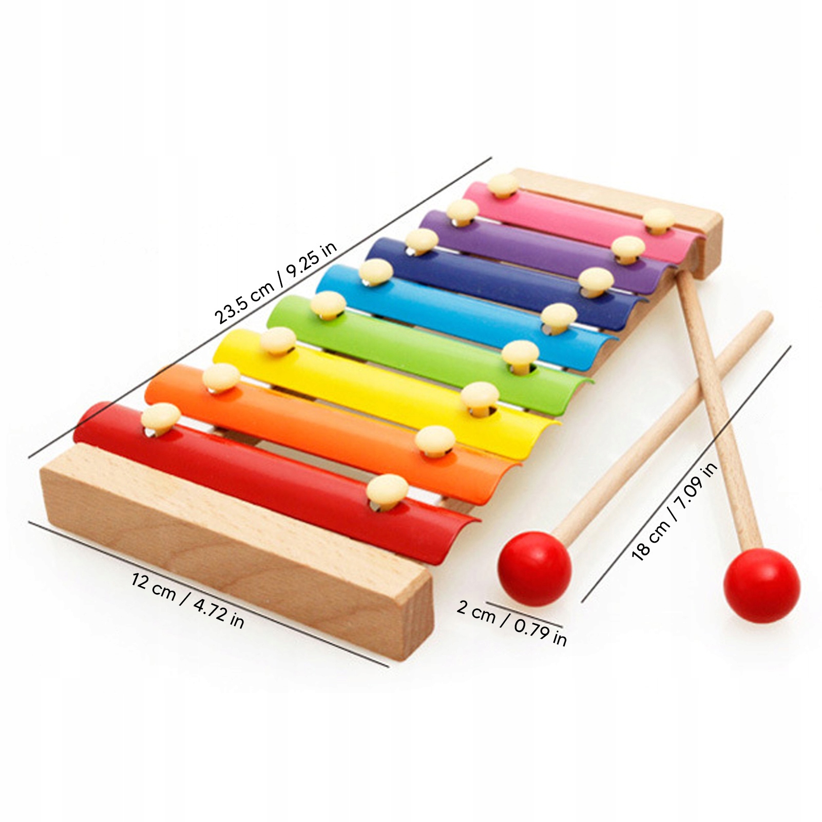 1, барвистий дизайн: цей восьмитональний ручний ударний інструмент має барвистий зовнішній вигляд і дизайн, що привертає увагу дітей і підвищує їхній інтерес до музики. 2. Відкритий ігровий процес: ксилофон із 8 нотами забезпечує відкритий ігровий процес, який дозволяє дітям вільно досліджувати та створювати музику, розвиваючи їхні творчі здібності та уяву. 3、Стійкий матеріал. Інструмент виготовлено з високоякісної твердої деревини, яка є довговічною та має хорошу якість звуку, забезпечуючи тривале використання та музичні враження. 4、Розширення діапазону: Це ручне фортепіано з перкусією на октаву має кілька гамм і може відтворювати ноти різної висоти, допомагаючи дітям зрозуміти та освоїти основні музичні концепції та техніки. 5、Освітня: восьмитональне постукування може сприяти розвитку слуху дітей, розвитку ритму та координації рук і очей, розвивати їхню здатність оцінювати й розуміти музику, а також є корисним освітнім інструментом. 6、Комплексний розвиток: Дитячі інструменти-ксилофони можуть одночасно активувати різні області мозку, допомагаючи вдосконалити багато важливих навичок, зокрема мову, мовлення, аудіювання, читання, творче мислення та пам’ять.