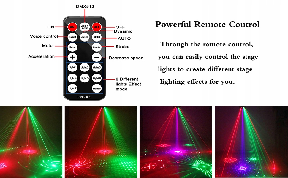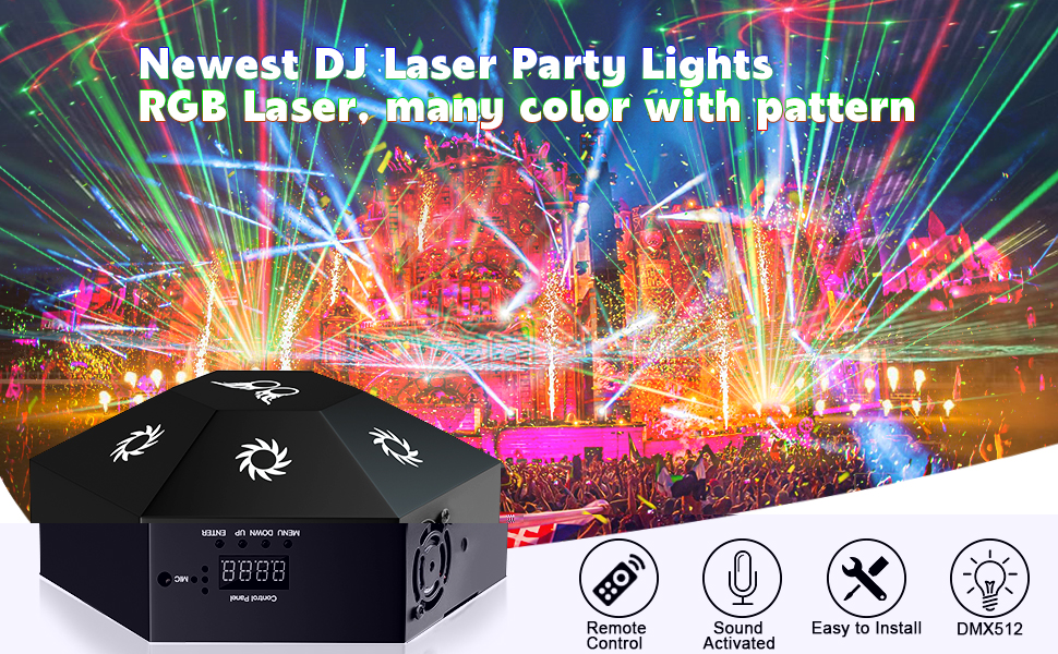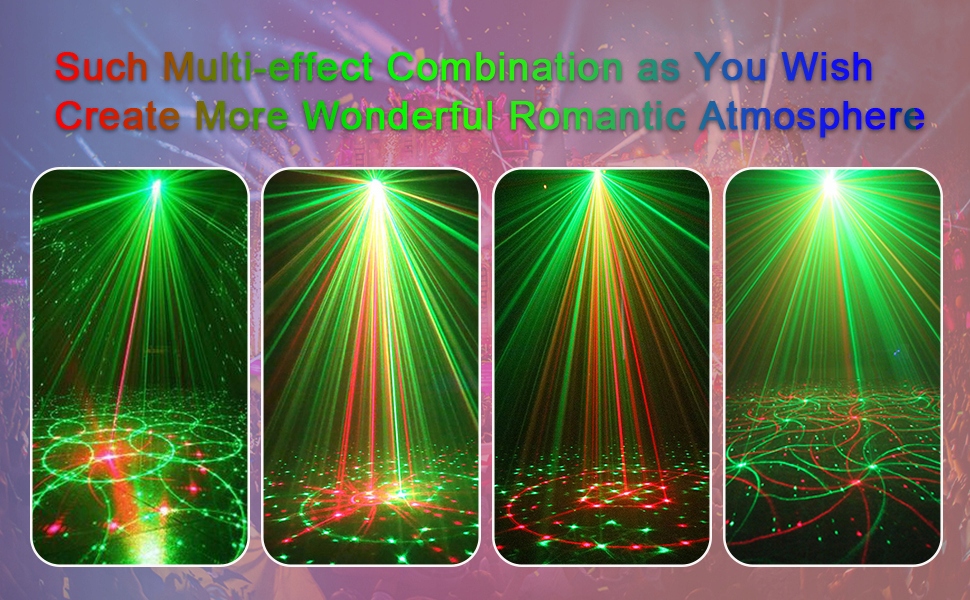 - Вогні сцени з 8 променями: це світло для вечірок має різні світлові ефекти. Ефект червоного, зеленого та синього світлового шоу, з голосовим керуванням, автоматичною функцією сигналу DMX512. Ліхтарі для ді-джеїв поєднуються з трьома функціями освітлення сцени, включаючи червоне та синє світло, світлодіодні стробоскопи та візерунок разом.