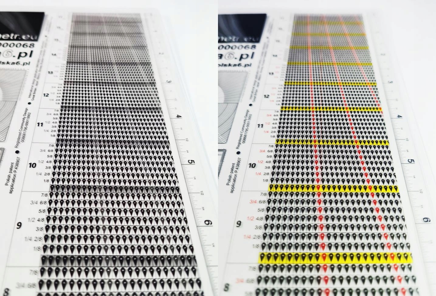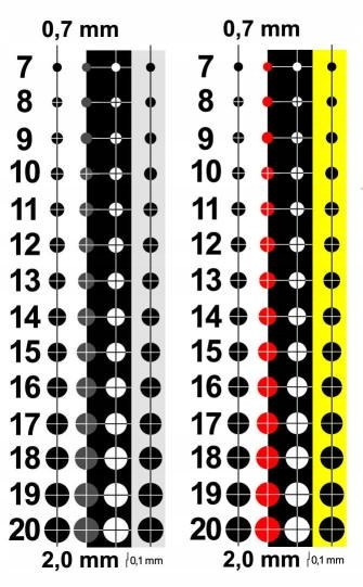 Darüber hinaus wurde der Messbereich von 20 auf 50 mm deutlich vergrößert. Durch eine derartige Vergrößerung und Präzisierung des Maßstabs stieg ihre Genauigkeit sprunghaft an, was wiederum dazu beitrug, dass die Interpretation der Ergebnisse erheblich eingeschränkt wurde. Auf der linken Seite des Messstabs werden die numerischen Werte in 1/8-Schritten angezeigt. Neben der Grundwerte 1/4, 1/2, 3/4 gibt es nun die neuen Werte 1/8, 2/8, 3/8, 4/8, 5/8, 6/8 і 7/8. Ein leerer Raum entspricht einem ganzzahligen Wert. In der Farbversion des Messgeräts werden dieclasssischen Grundwerte in Rot angezeigt.