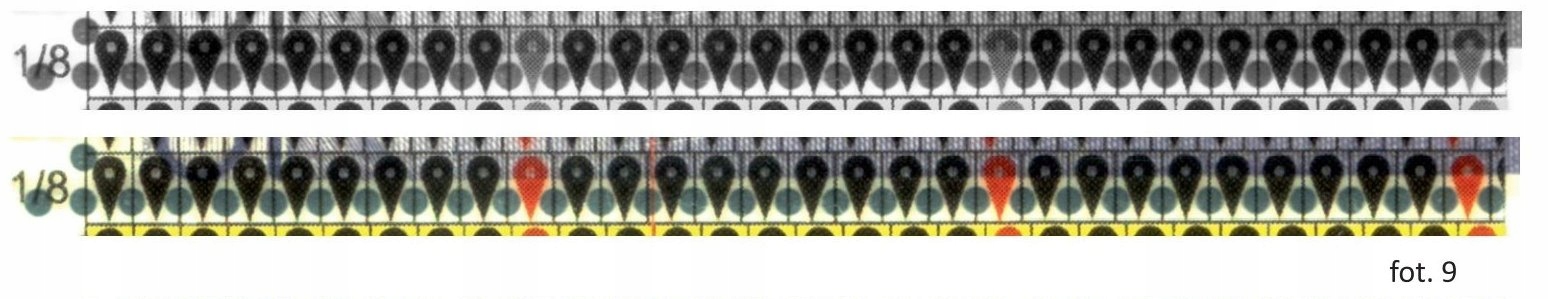У верхньому правому куті є додатковий захід, спеціально присвячений перевірці друкарських наддруків польських марок так званого репринтного видання. «Krakowskiego»з 1919 року. Він використовується для точного вимірювання висоти самого відбитка, а також відстані між першим і другим рядком і ромбом. Більш детальна інформація про дослідження цих відбитків в літературі по темі. Наприклад: Michael Lenke: Die Krakauer Ausgaben der polnischen Post von 1919. Quickborn/Elbe, im April 1919. Приклад методу вимірювання показано на фото 10.