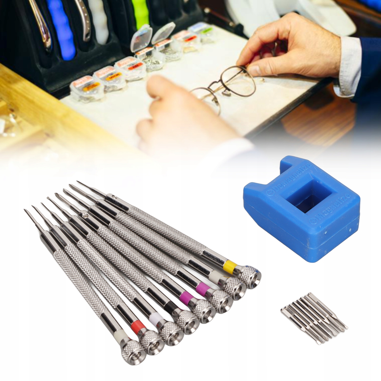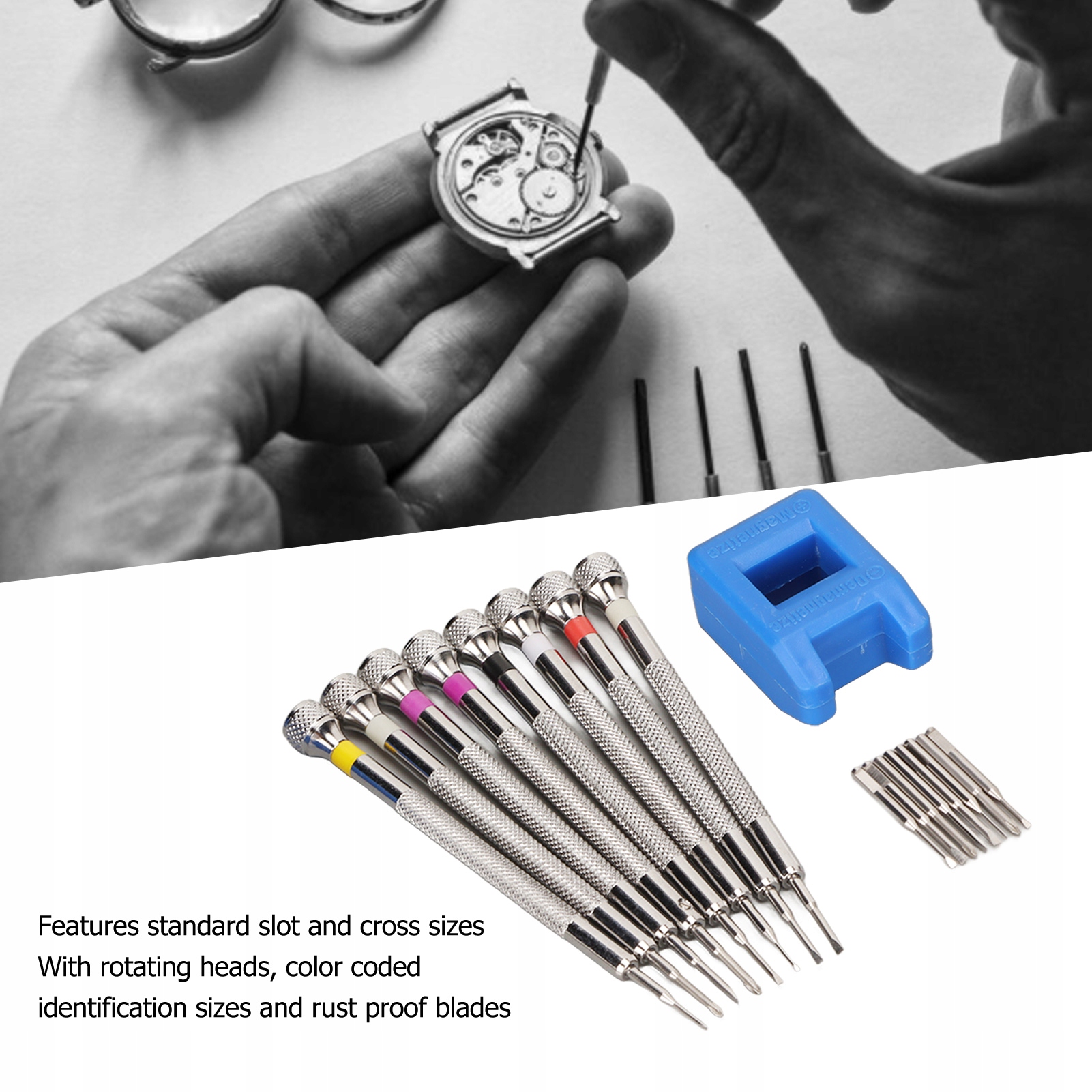 1. Сталь: Слідкуйте за тим, щоб набір викруток виготовлений з легкої сталі, твердо і надійного, стійкого до зносу та міцного, стійкого до іржі та корозії, довге життя, це може бути використане, безумовно,. Універсальний: Набір викруток для ремонту годинників ідеально підходить для ремонту годинників, заміни акумулятора годинника, зняття гвинтових комірок браслетів годинника, ремонту окулярів, виробництва ювелірних виробів, ремонту ноутбуків та інших ремонту електроніки. . За допомогою намагнітного та переговорного пристрою: Клинок викрутки може бути намагнічено, переміщуючи його через середній отвір та перетворення, переміщуючи його через половину отвору. СПИСОК: Набір викрутки для заміни годинника виробляється за допомогою точної технології та містить стандартні розміри розетків та хрестів з обертовими головами, ідентифікаційними розмірами, позначеними кольорами та лопатями, стійкими до іржі. Зручне зберігання: Набір викруток для обслуговування годинника оснащений прозорим зберіганням, компактним та портативним, простим для зберігання та переміщення, запобігає лезу та викрутку.