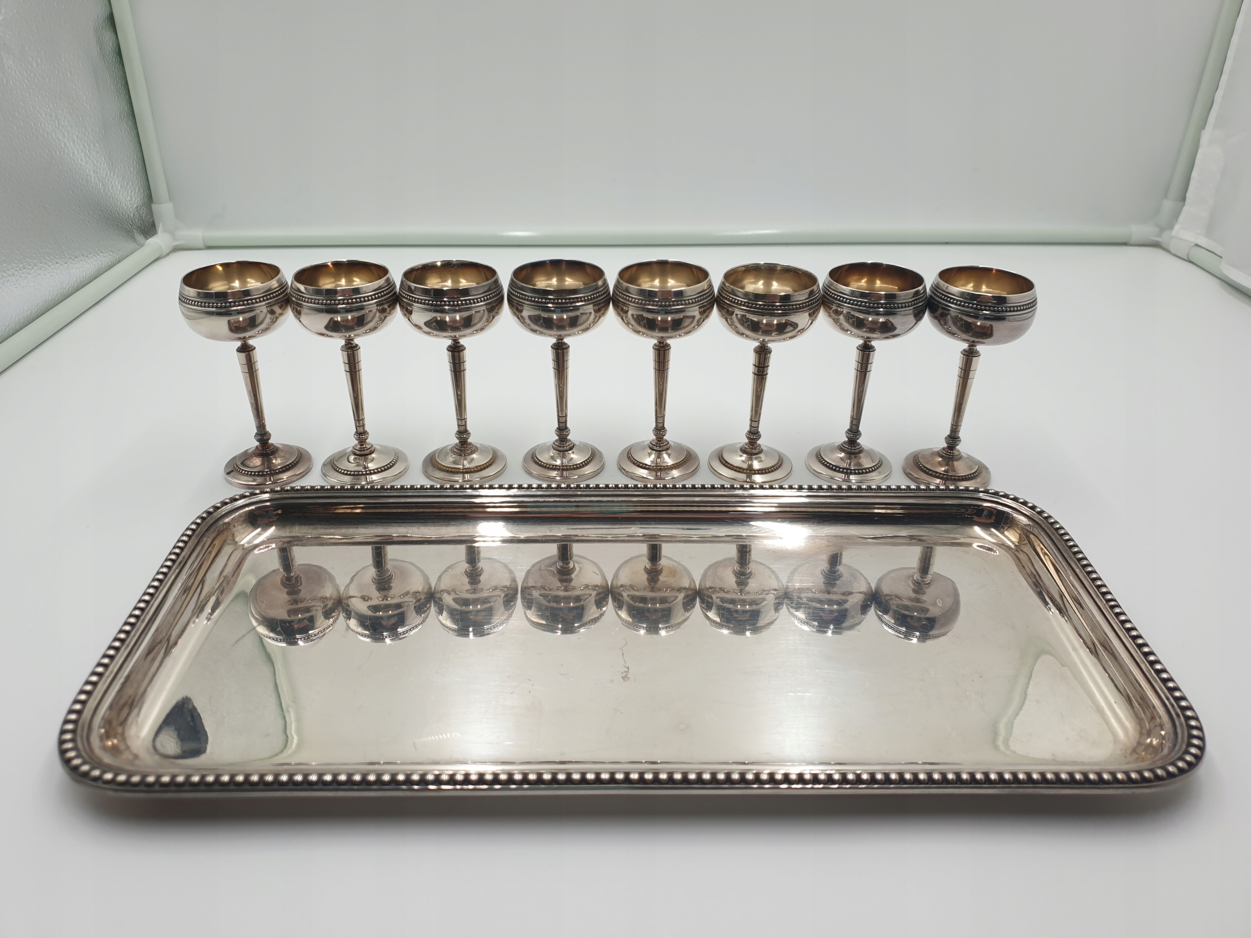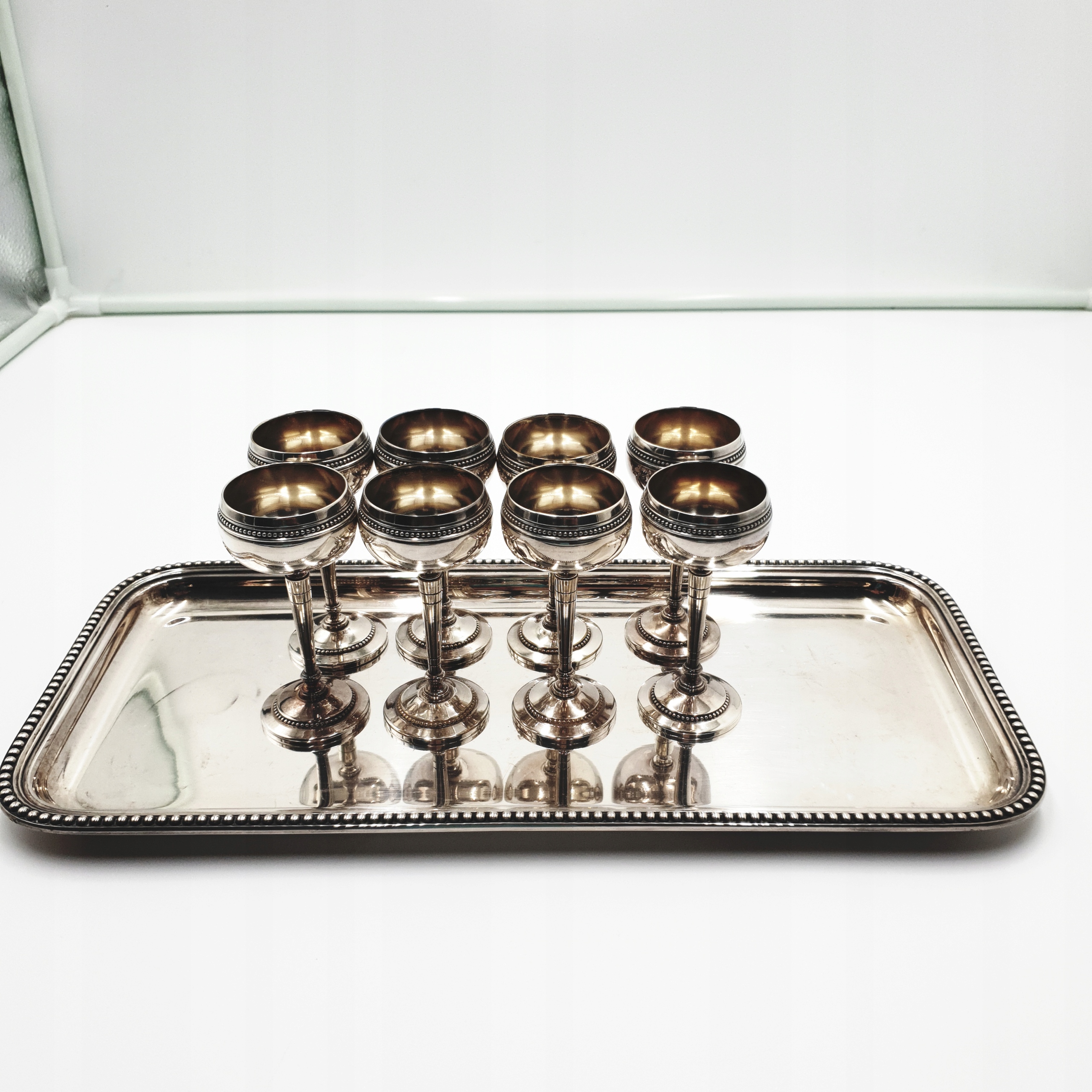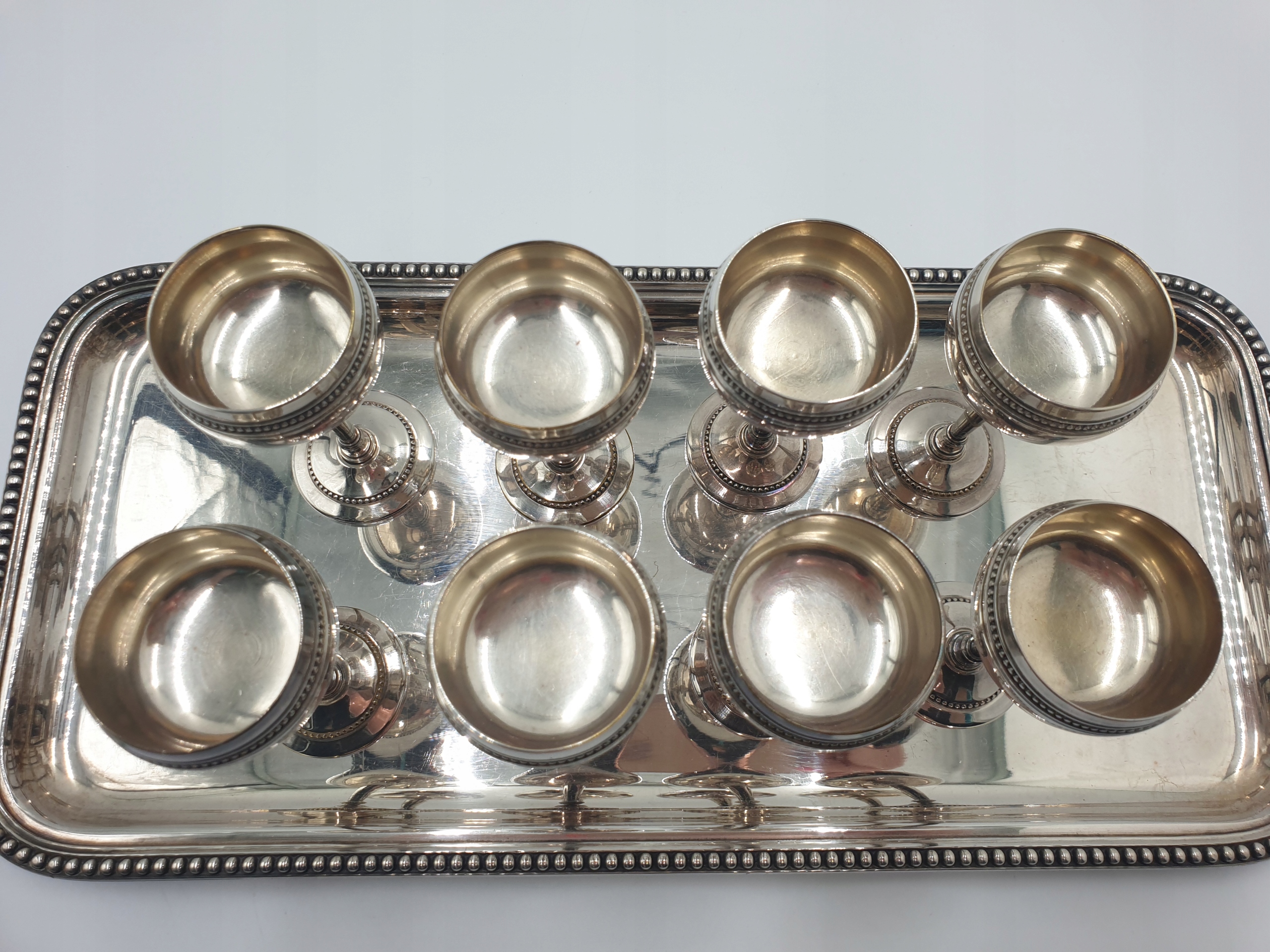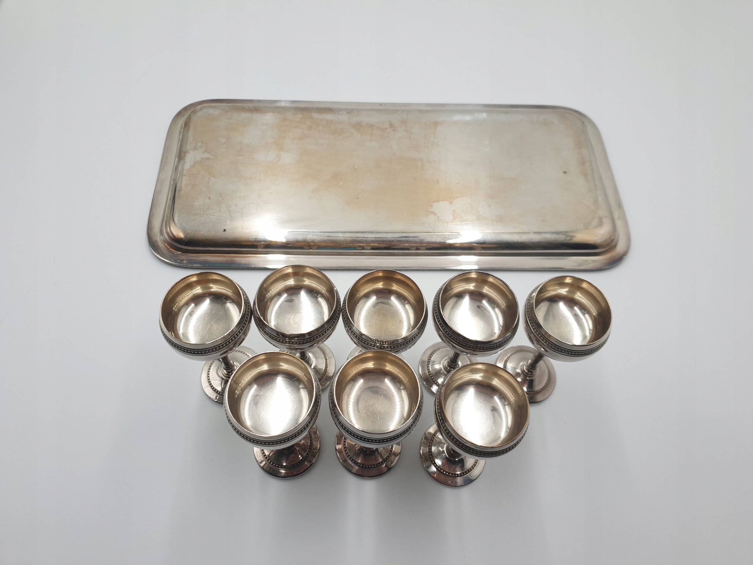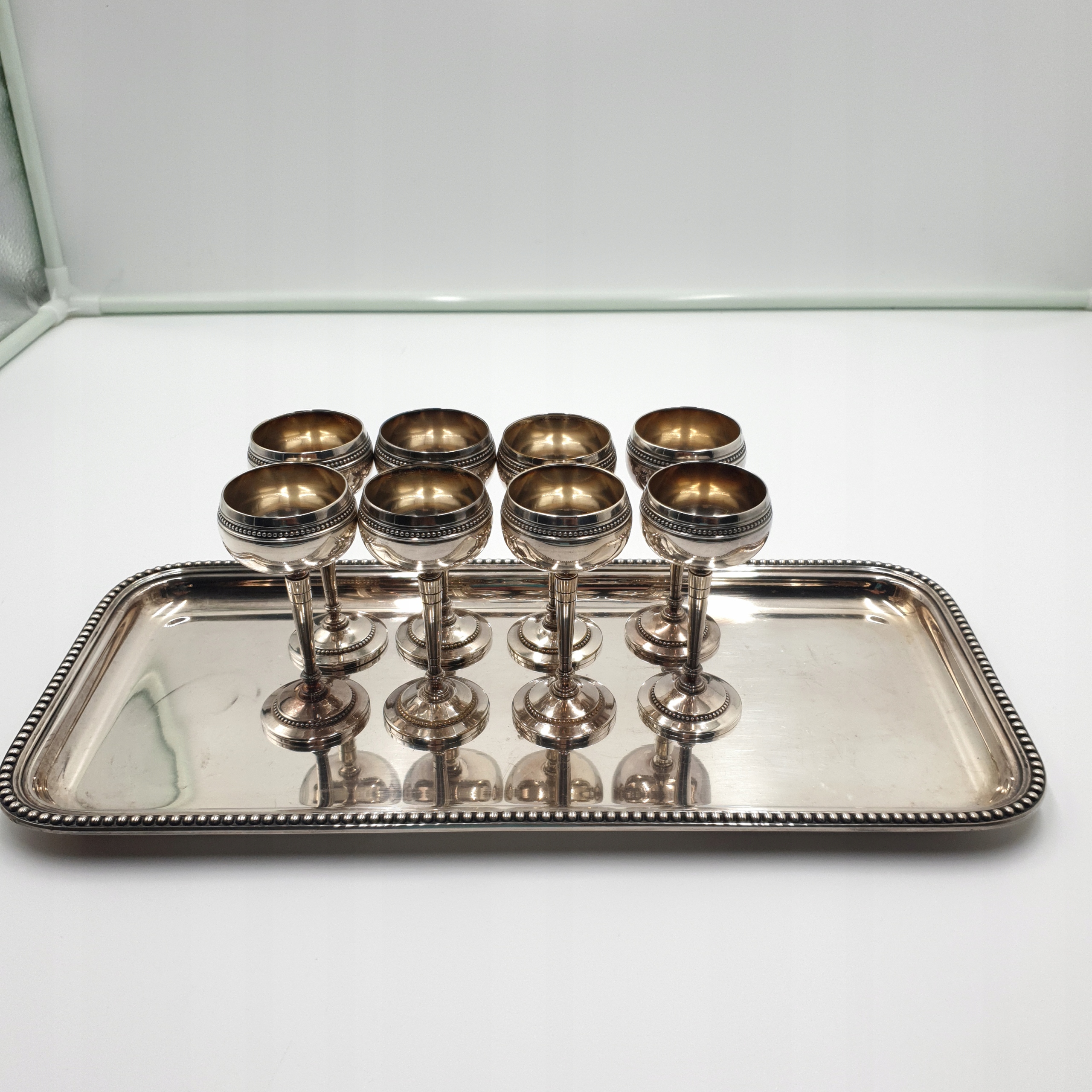 8 посріблених келихів на металевому підносі, 19 ст