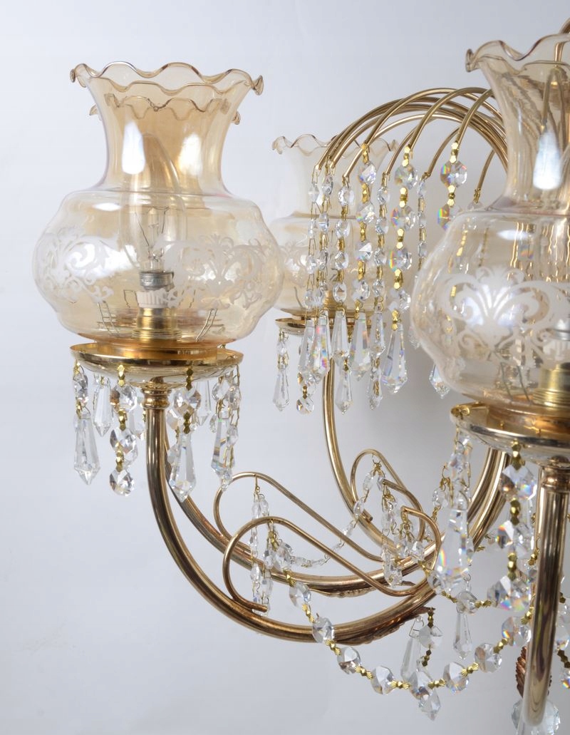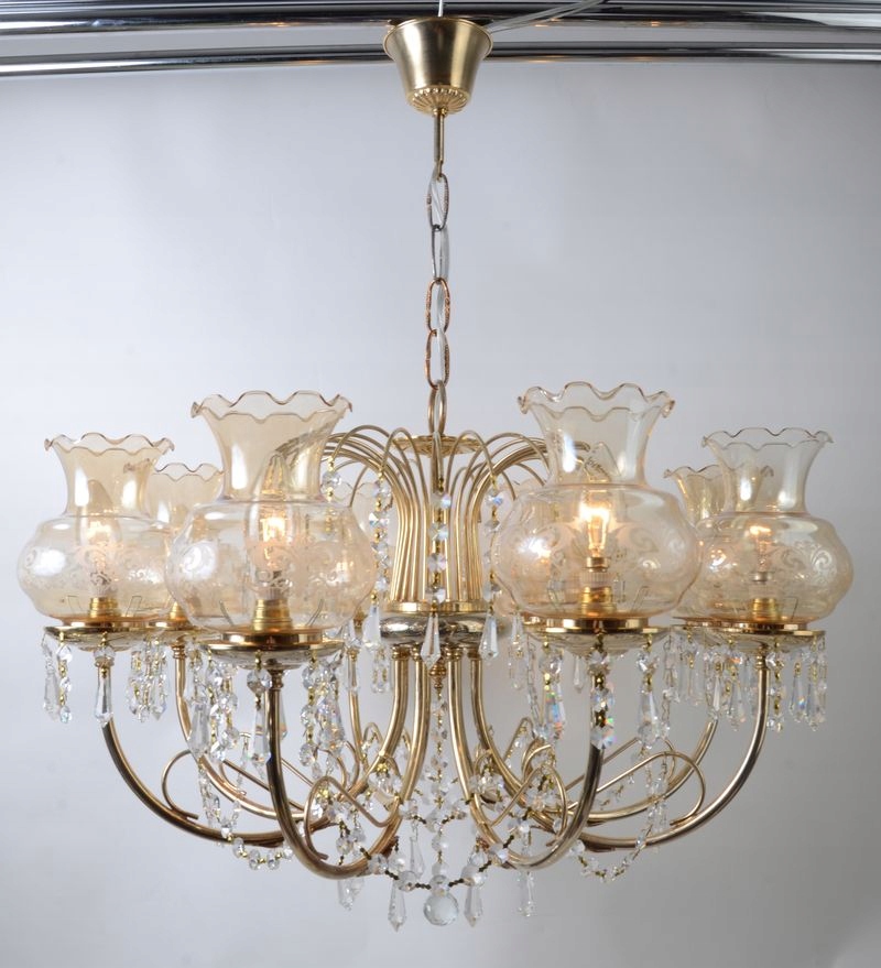 Сліпучий стильний золотий 8-рамковий світильник, латунь, кришталеві плафони, Іспанія, 1960-ті