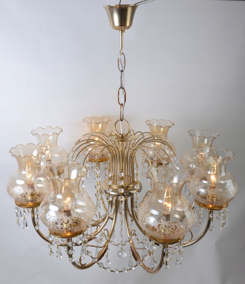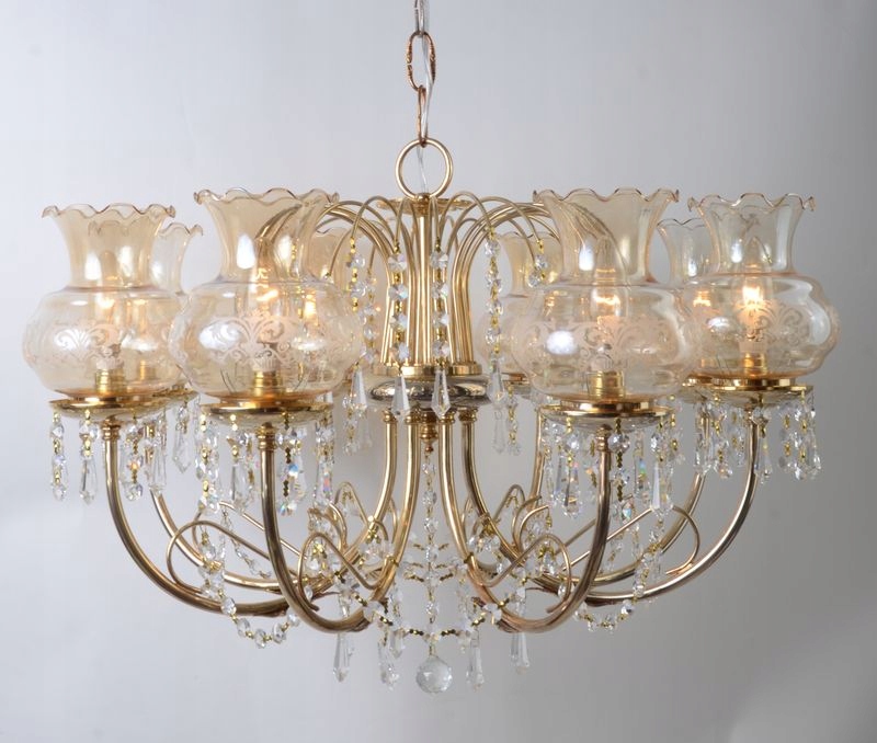 Предметом аукціону є стильний 8-рамковий світильник з Іспанії 1960-х років. Його структура складається з 8 плечей, увінчаних чудовими абажурами. Люстра виготовлена з латуні золотого кольору. Товар виглядає феноменально!!! Плечі світильника чітко вигнуті, і кожен декор є його яскравою перевагою. Все це доповнюється чарівними абажурами, які піднімають настрій предмету, надаючи йому класу та елегантності. Абажури виготовлені з міцного чайного скла, мають тонку рюш і гравійовані візерунки. Додатковою прикрасою і кульмінацією всього є нитки кристалів Swarovski, які красиво виблискують на світлі. Кристали Swarovski також сяють на плафонах, прикрашаючи кожен з них і підкреслюючи характер всього світильника. Люстра чудово прикрасить вітальню, радуючи своїм сяйвом кожного гостя. Лампа супроводжується сертифікатом галереї Rossar, який підтверджує місце і час походження виробу. Я закликаю вас придбати його!!!