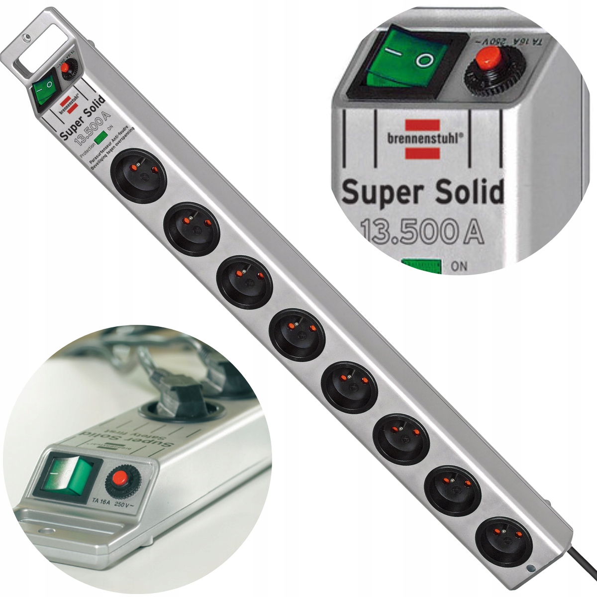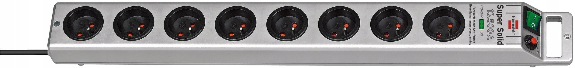 Super-Solid стрічка перенапруги з 8 розетками від Brennenstuhl у сріблі та з кабелем 2,5 м переконує своєю якістю і безпека в усіх сферах. Завдяки спеціальному проходу кабелю навпроти вимикача керувати цим подовжувачем особливо легко, наприклад, під столом. Він не тільки має підвищений захист від контакту, але й переконує такими характеристиками: