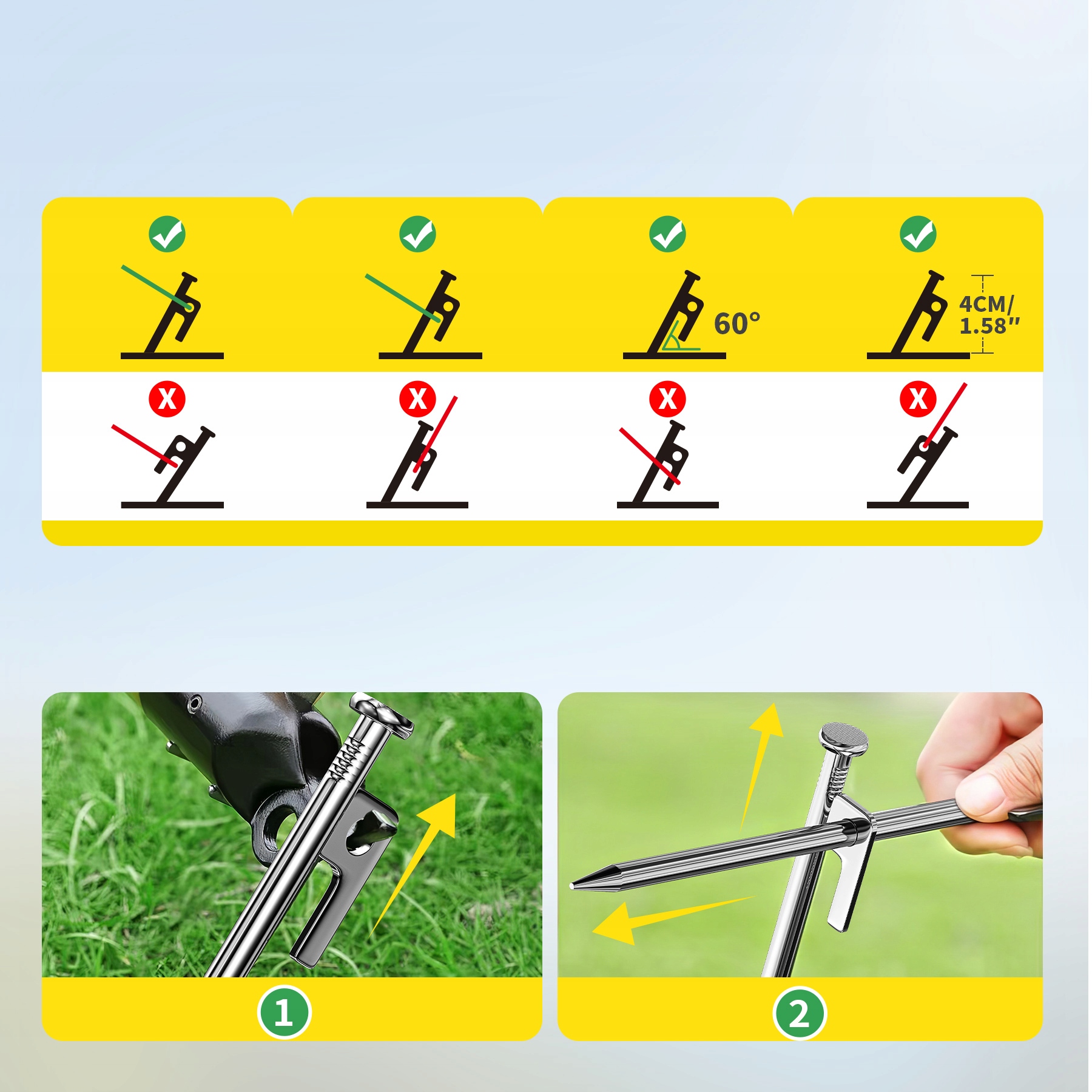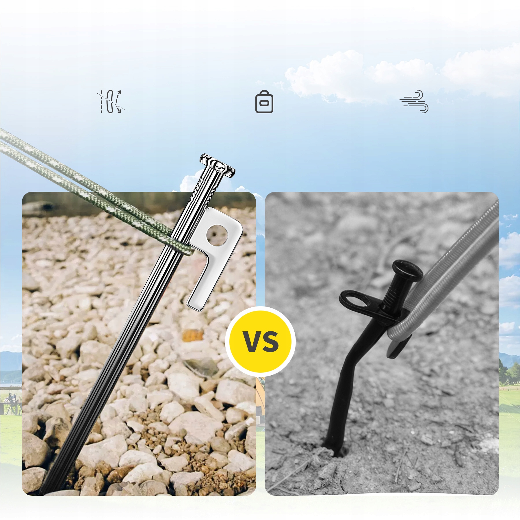 Кілки для наметів виготовлені з високоякісної сталі та не гнуться, що робить їх придатними для будь-яких умов ґрунту, будь то твердий чи м’який, вологий чи сухий. Оцинковане покриття означає, що вони не іржавіють навіть під впливом дощу та вологи, забезпечуючи тривалий термін служби.