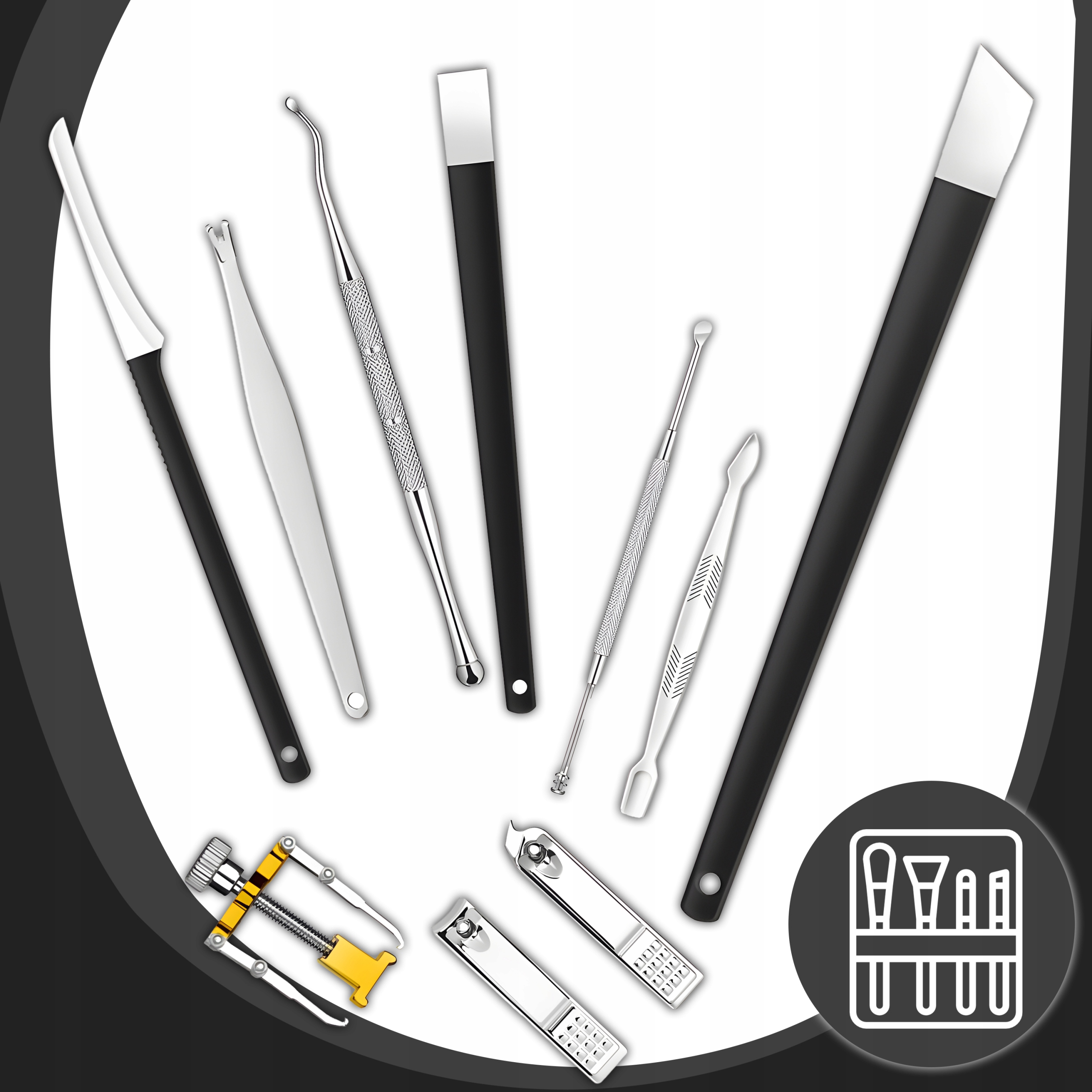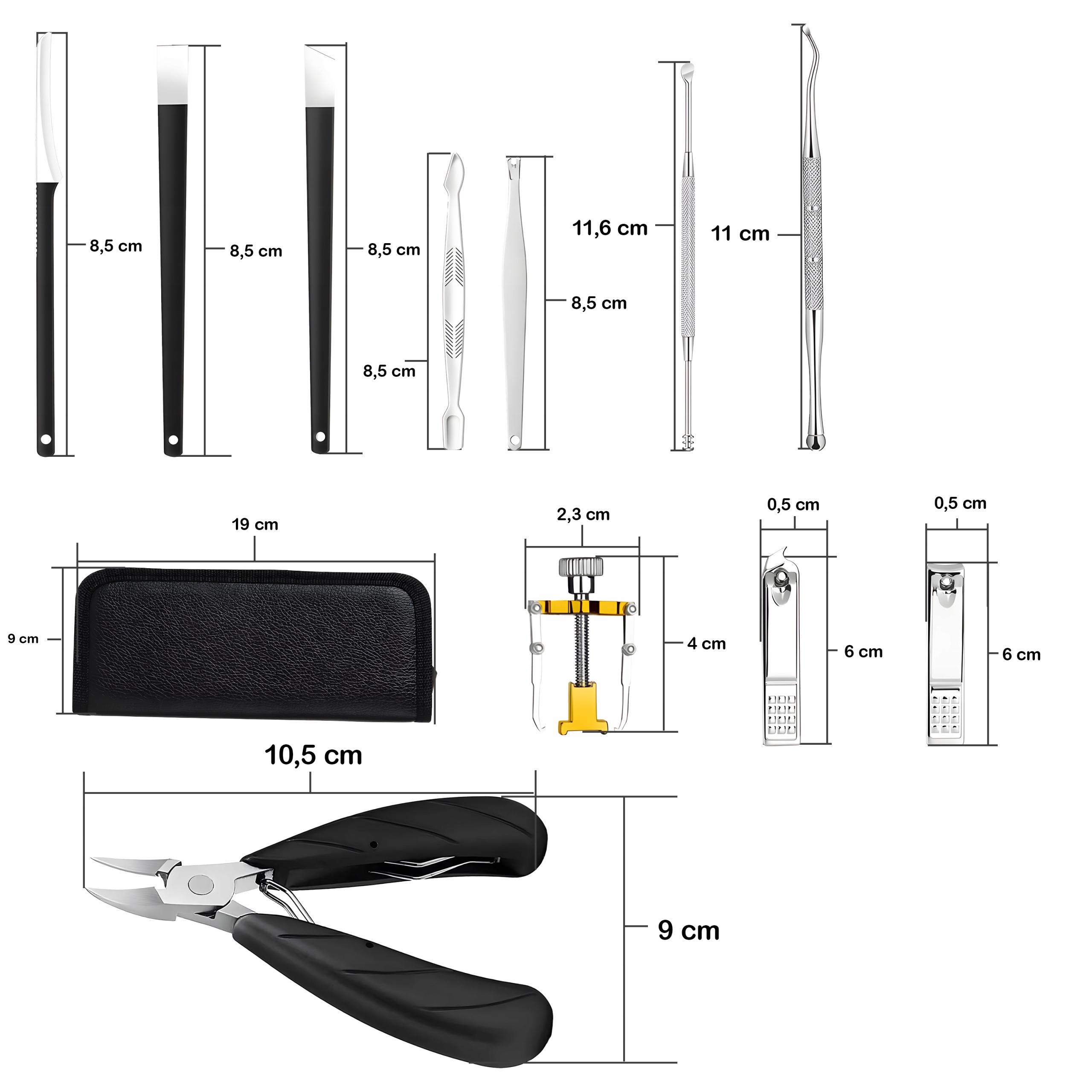 Інноваційні інструменти: У набір входить важіль для безболісного видалення врослого нігтя, вигнуті кусачки для точного формування нігтьової пластини та делікатний інструмент для видалення кутикули, гарантуючи ефективність і комфорт.