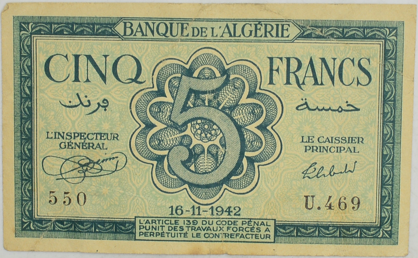 8.xx.Algieria , 5 франків 16/11/1942, P.91, St.3+