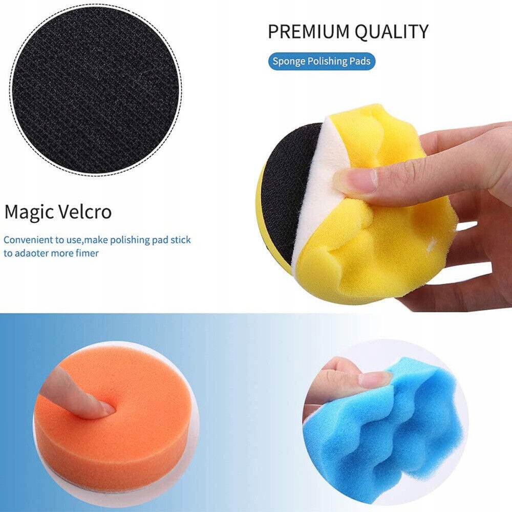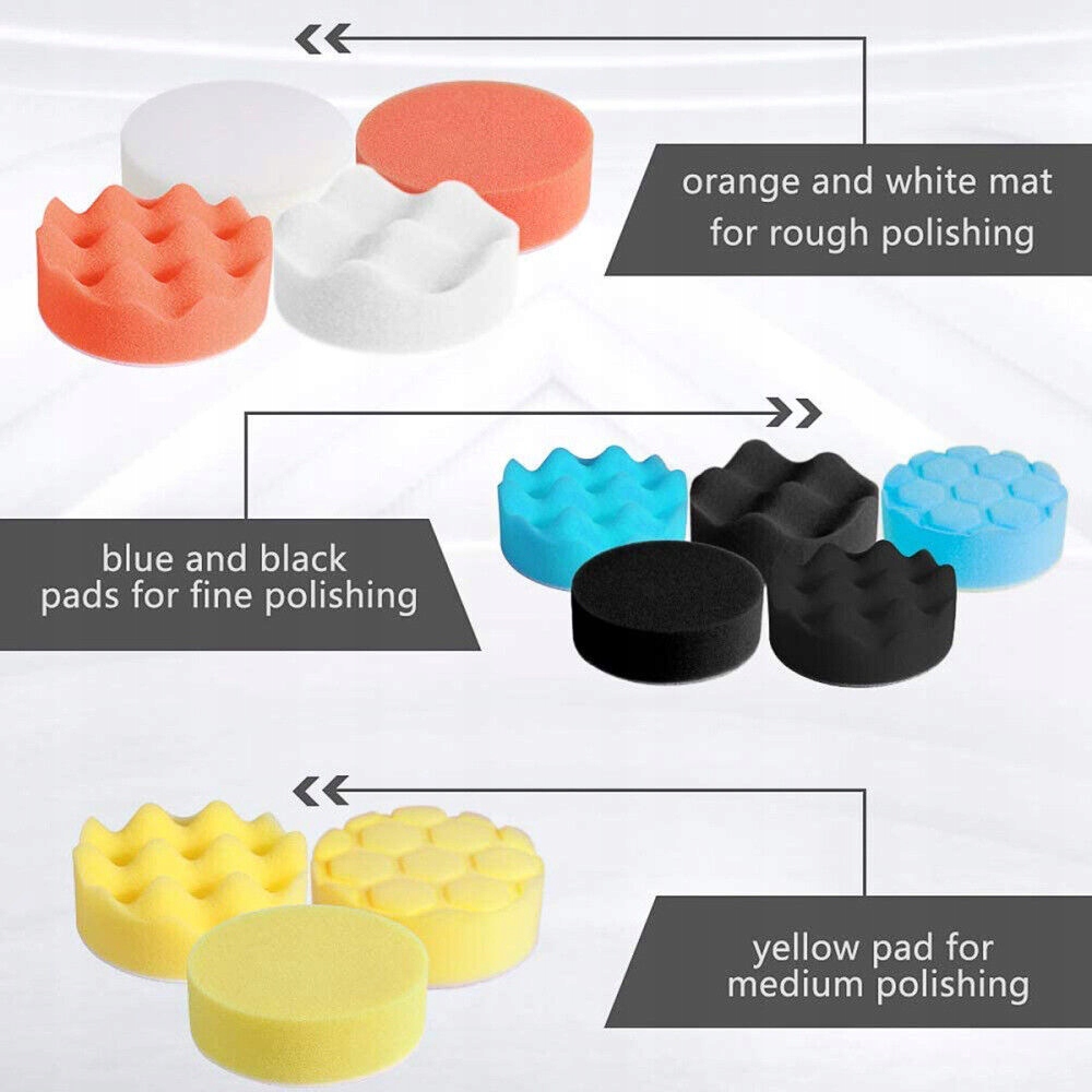 помаранчева та біла губка для сирого полірування, жовта губка для помірних полірування темних автомобілів, зеленої та червоної губки для помірних полірувальних легких автомобілів, чорної та синьої губки для точного шліфування.