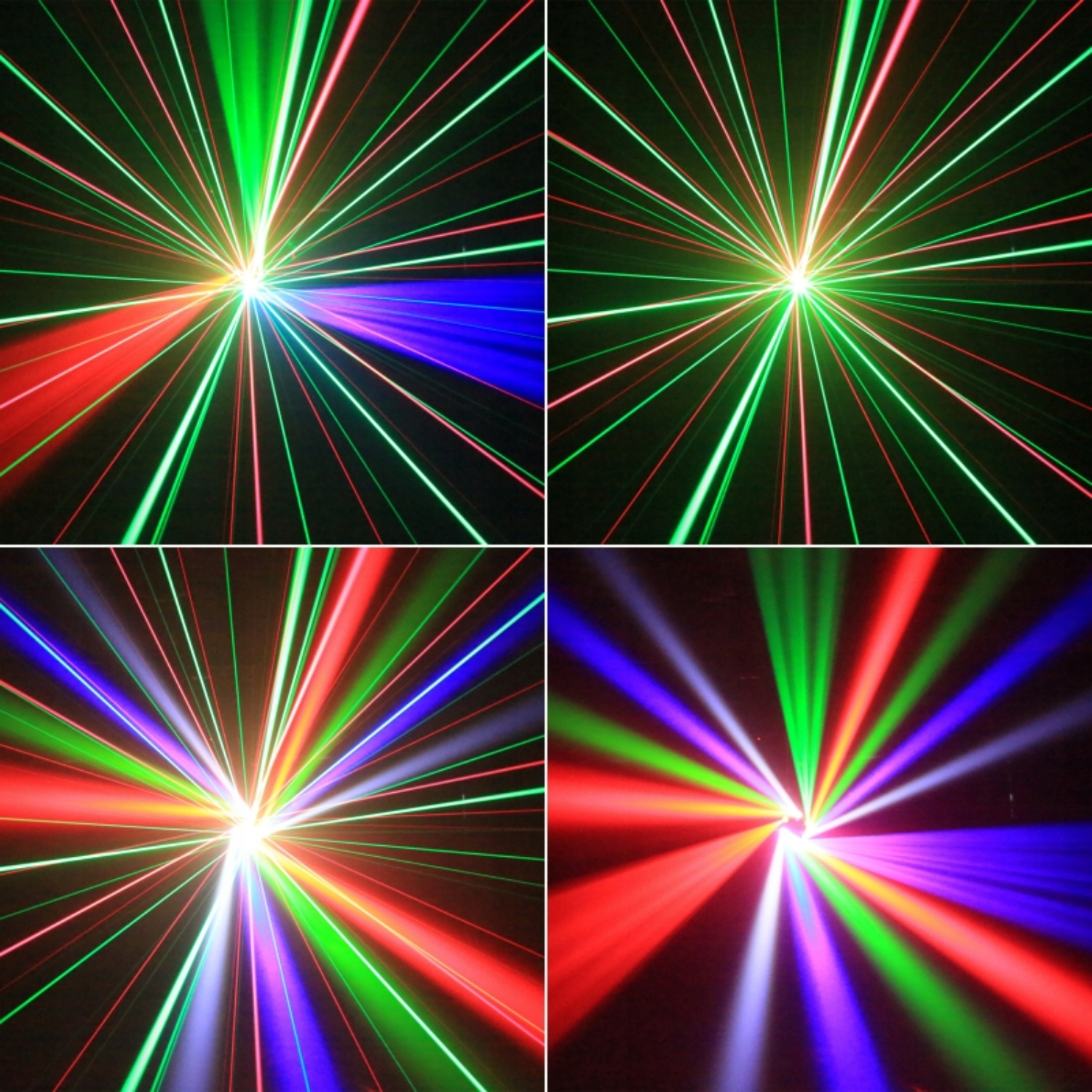 Промені + Лазери + Візерунки - усе живиться від 12 світлодіодів по 3 Вт, 53 світлодіодів RGB і червоних/зелених лазерів. Крім того, жовто-білий стробоскоп для більш насиченого ефекту.
