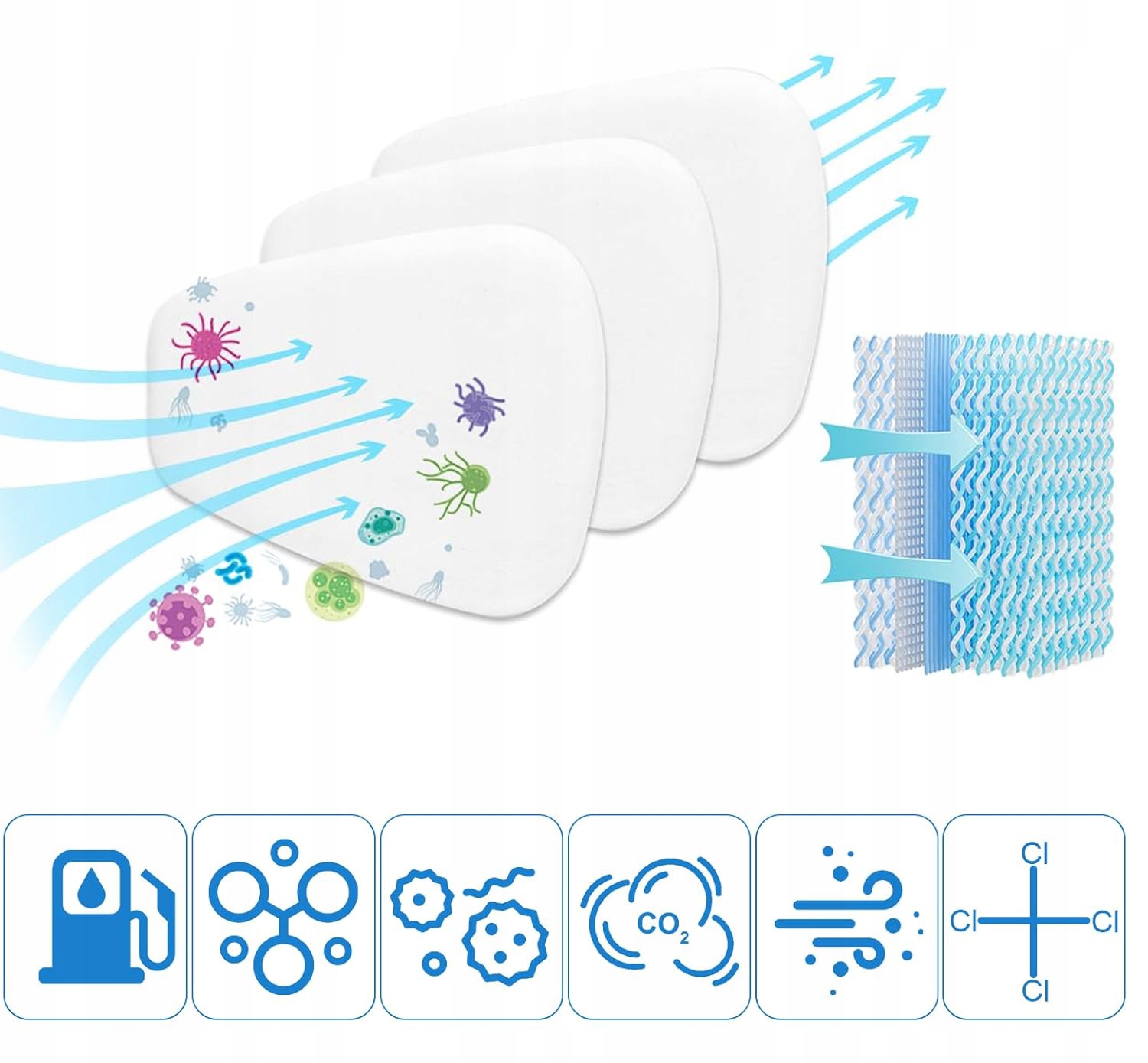 Ватняна фільтруюча маска виготовлена з високоякісної бавовни та безпечного нетканого матеріалу з великою площею фільтрації, що гарантує високу повітропроникність та низький опір диханню, завдяки чому можливе рівне дихання. Набір підходить до фільтрів 6000, 6200, 7502, 6800, 7501, FF402.