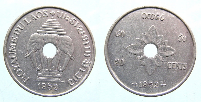 8505. ЛАОС, 20 ЦЕНТІВ, 1952 AL. 27 мм,
