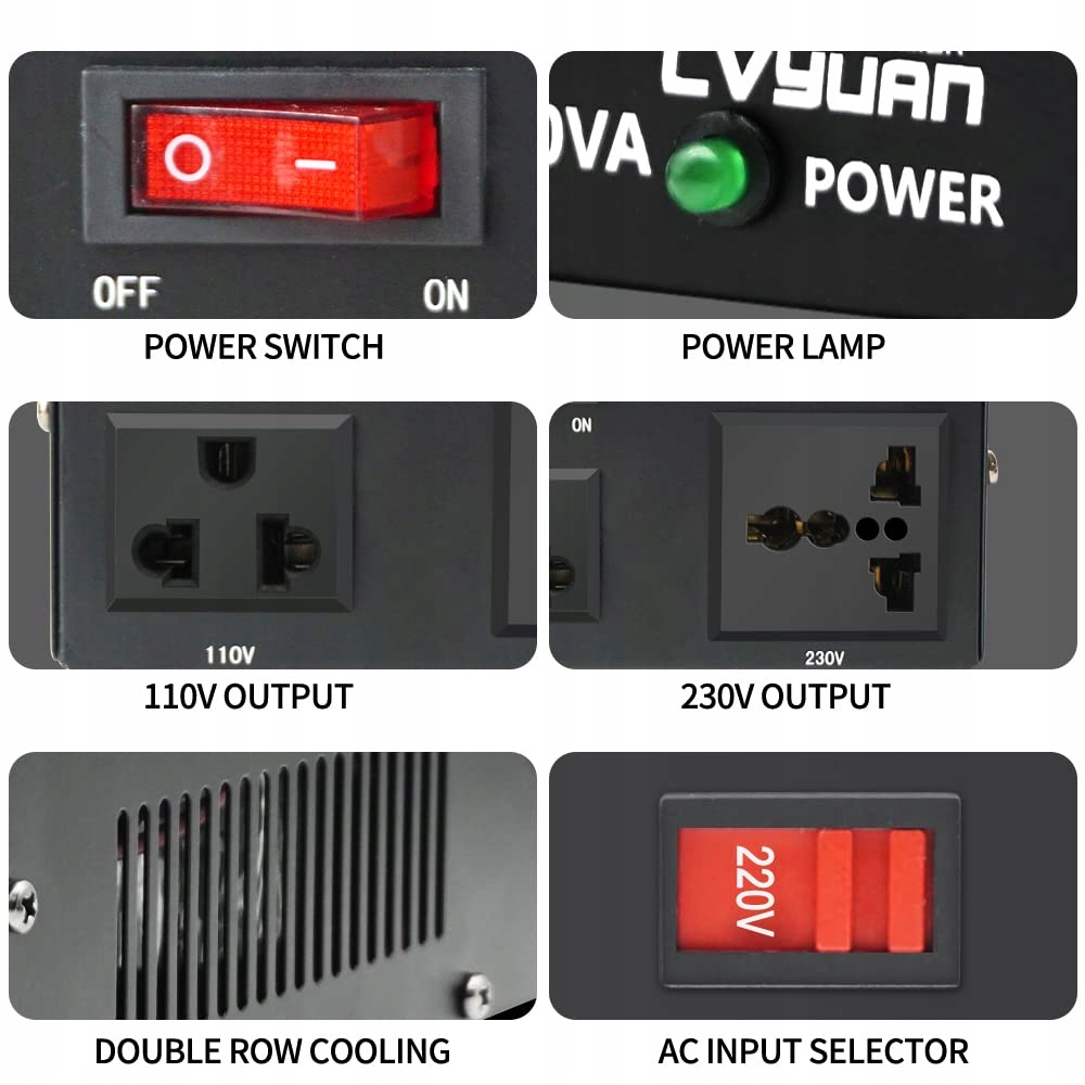 Вихід: 110-120 В змінного струму через 1 розетку США (NEMA) для 2- або 3-контактних вилок і 220-230 В змінного струму через універсальну розетку.