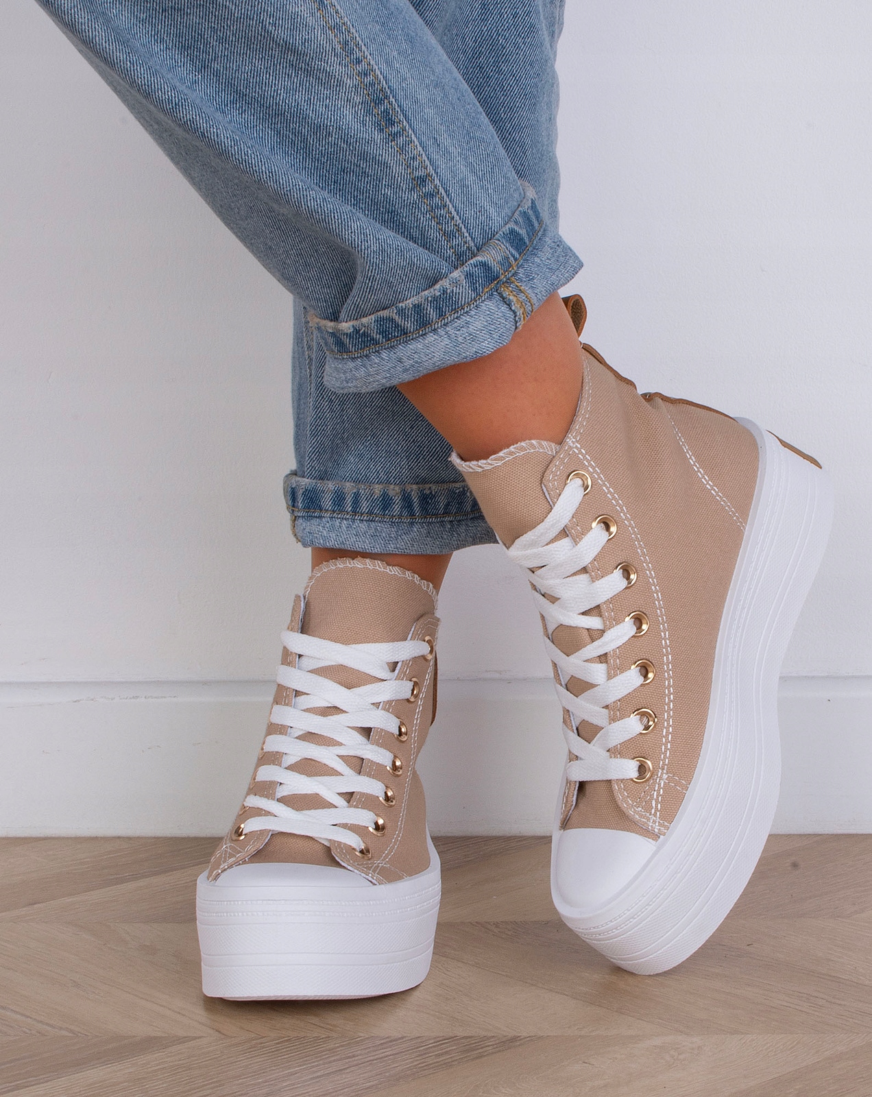кросівки бежевих жінок, виготовлені з тканинного матеріалу. Ідеально підходить для весни та літа. Товста, не -Slip Sole - Платформа. Земля вгорі, кросівки дотягуються до щиколотки. Взуття в відтінках бежевого кольору - це мускулатура для цього року.