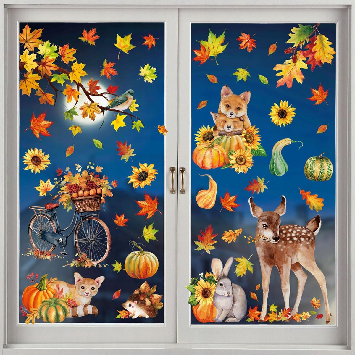Введіть теплий осінній клімат для вашого будинку завдяки 88 вікна наклейок. Кожна з наклейок представляє чарівні конструкції мультфільмів, такі як ведмеді та осінні листя, які прекрасно відображають атмосферу цього сезону. Це ідеальний спосіб прикрасити будинок на День подяки або просто додати затишок інтер'єру в осінні дні.