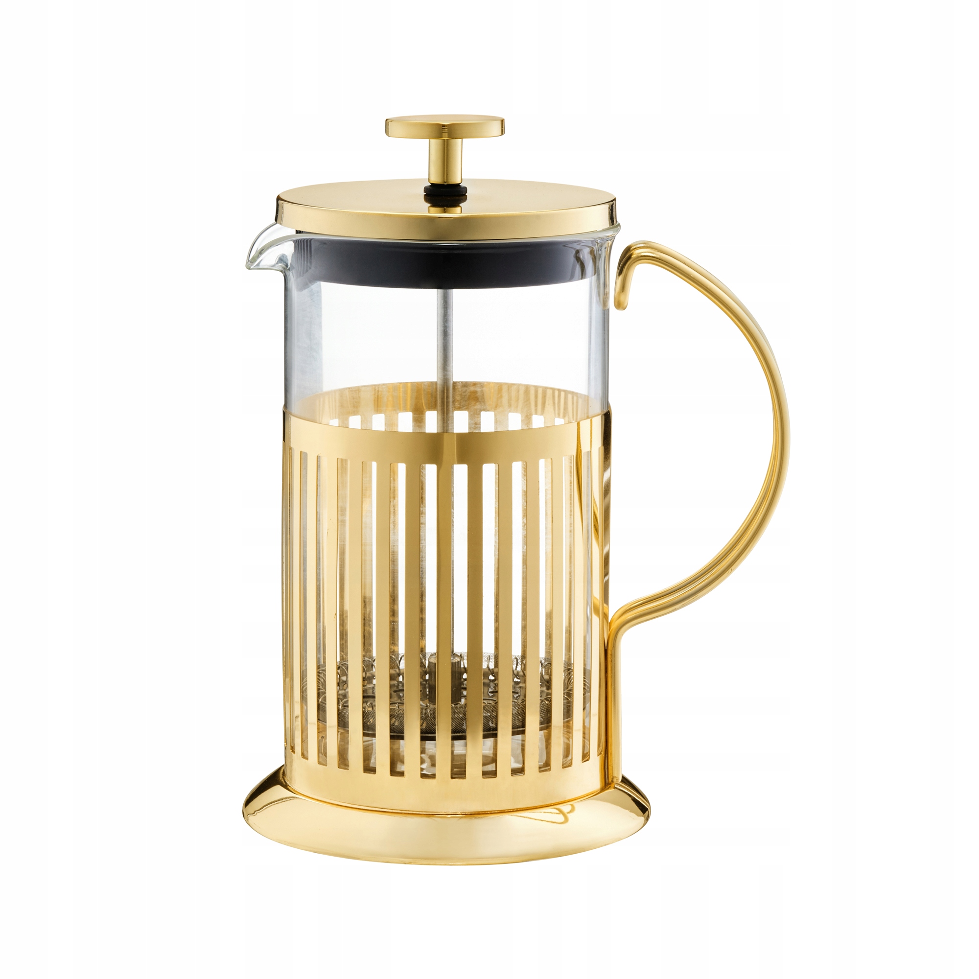 Заварка Royal ємністю 350 мл виготовлена з тонкостінного жаростійкого скла з кришкою із сталі золотистого кольору. Стійкий до високих температур. Він має зручну ручку та поршень із фільтром із нержавіючої сталі, який дуже точно зберігає кавову гущу всередині заварника.