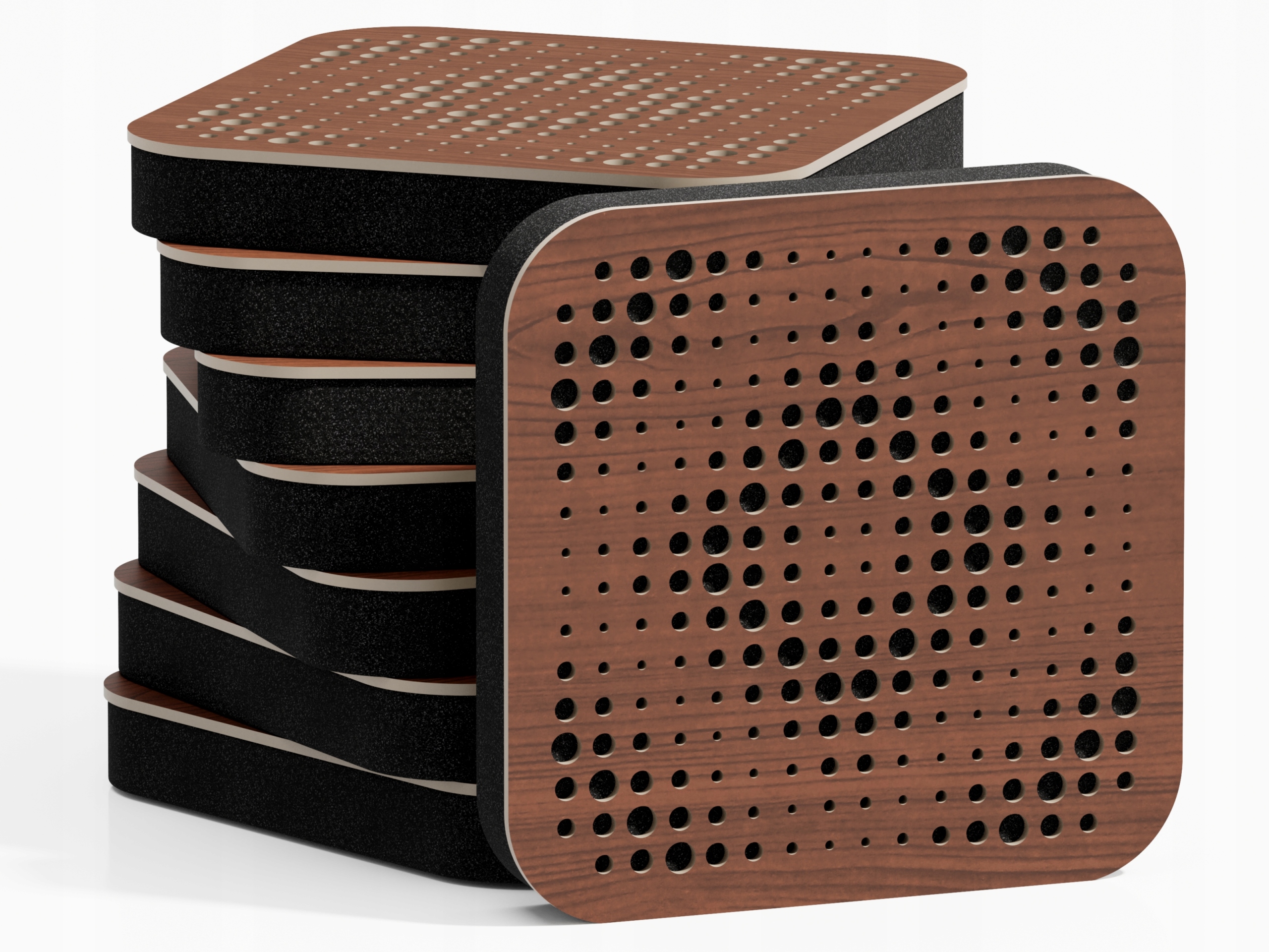 Звукопоглинальні панелі завдяки особливій мікропористій структурі акустичної піни перетворюють звукову енергію в теплову енергію, поглинаючи її, а за допомогою 3D-поверхні частково розсіюють відбитий звук.