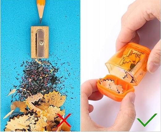 - Кришка та подвійні отвори - Точилка для олівців із подвійними отворами, два отвори різного розміру, можна використовувати для заточування олівців різної товщини. Чохол добре захищає лезо та запобігає його іржавінню.