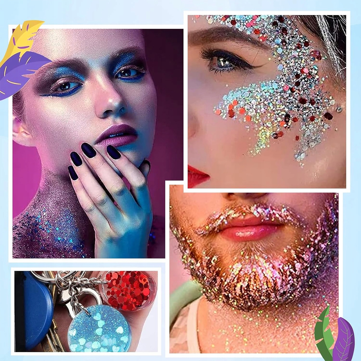 ✨ Сяюча універсальність: відкрийте для себе наш набір із 9 яскравих флаконів із блискучим гелем білого, золотого, сріблястого, рожевого, зеленого, фіолетового, червоного, королівсько-синього та синього кольорів. Кожен колір містить блискучі зірки, місяці та шестикутники, які зачаровують кожною грою світла. Ідеально підійде для демонстрації вашого унікального стилю або як креативний подарунок.