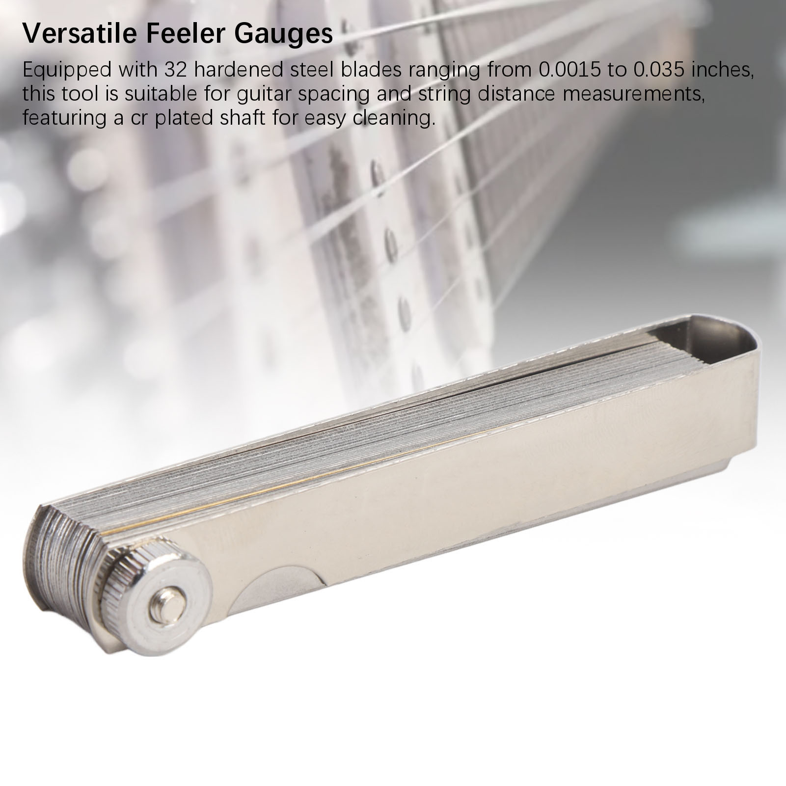 2. Універсальний щуп: оснащений 32 лезами із загартованої сталі розміром від 0,0015 до 0,035 дюйма, цей інструмент підходить для вимірювання відстані між гітарами та струн, а також містить ролик CR для легкого очищення.
