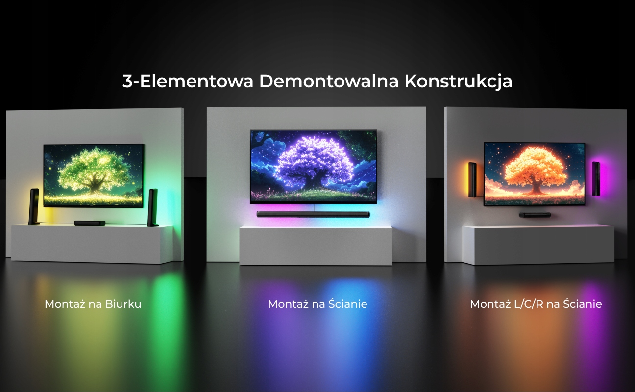 звукова смуга Apollo S90 для смарт -телевізора , з мільйонами кольорів, що слідують за траєкторією просторових звукових об'єктів , перетворюють вечірні фільми на вдосконалення аудіовізуального свята. Ця звукова панель забезпечує 6 регульованих режимів RGB та мільйони кольорів на вибір, а вогні динамічно змінюються за допомогою аудіо -ритму.