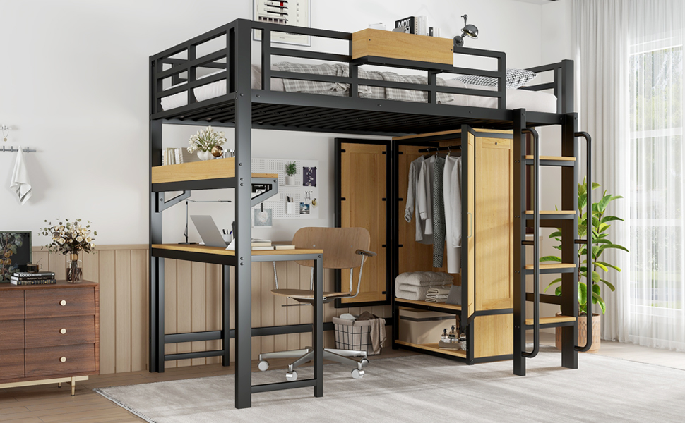 Залізне ліжко, двоярусне ліжко, з двома гардеробом, сходами з порушеннями, столом та полицею для зберігання, верхнє ліжко з відсіками для зберігання, залізо + mdf, чорний + натуральний, 90x200 см