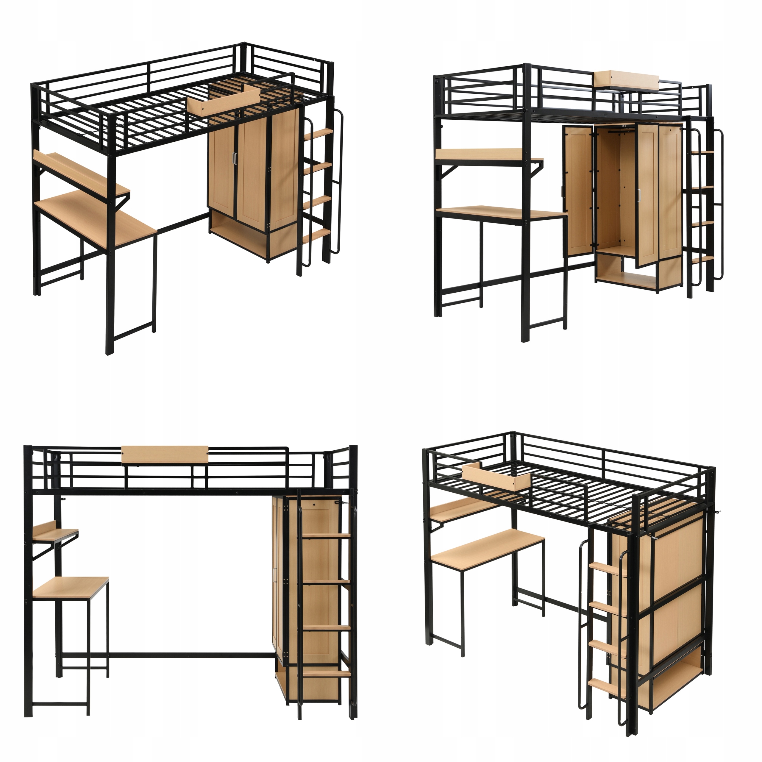 90x200 двоярусне ліжко, зі столом, гардеробом, верхом, чорний+натуральний, металевий+mdf