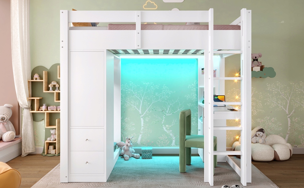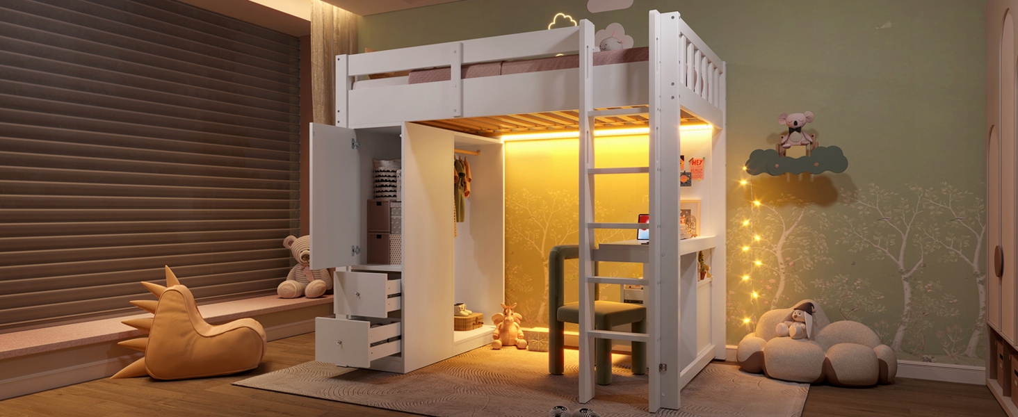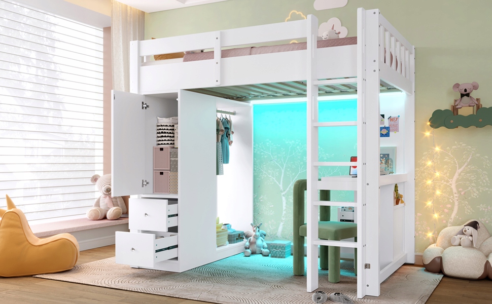 двоярусне ліжко 90x200 з 4 ящиками та 1 шафою для зберігання, стіл під ліжком, відкритим гардеробом, світлодіодним та USB -освітленням, біле