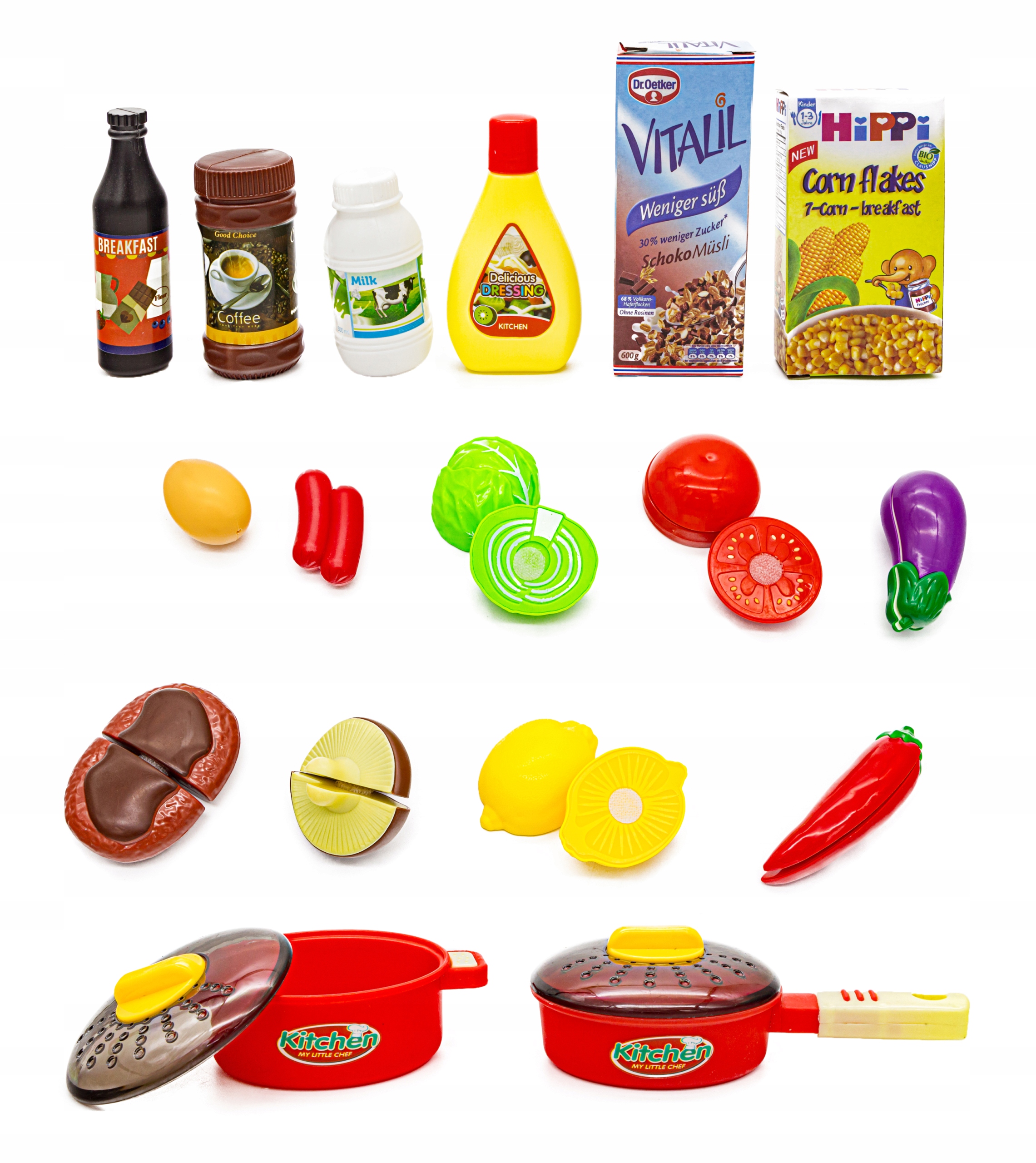 Маленька господиня/господарка має у своєму розпорядженні широкий вибір посуду, каструль і столових приборів. Не забули також про овочі, фрукти та картонну упаковку, що імітує харчові продукти.