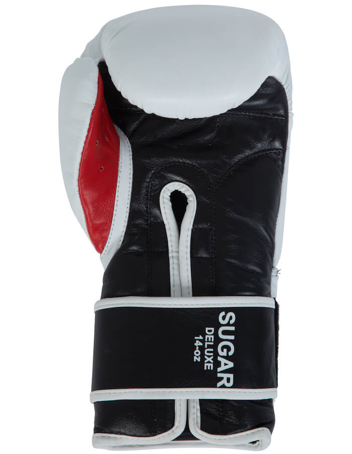 "Sugar de luxe" - це вдосконалена версія професійних боксерських рукавичок з натуральної шкіри, на липучках Зсередини вони заповнені чотирма шарами поролону різної щільності і складу. розміщені в «жолобі» манжети, що запобігає його травмуванню, що забезпечує кращий захист від розстібання липучок, а також вигнутого прихованого «великого пальця». забезпечують кращий захист пальця від вивиху.