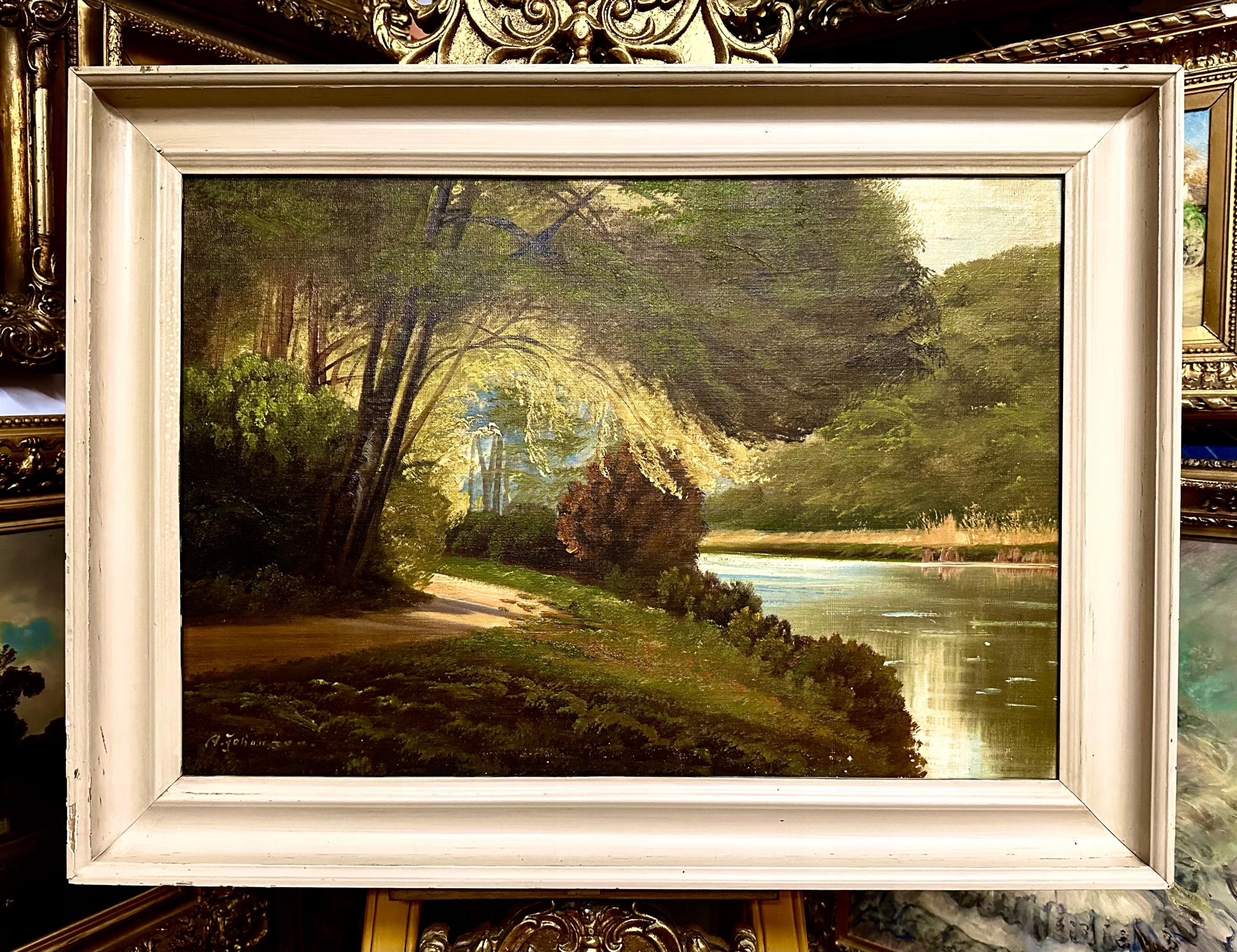 A. JOHANSEN - RZEKA POŚRÓD DRZEW W LETNIM KRAJOBRAZIE STARY PIĘKNY OBRAZ