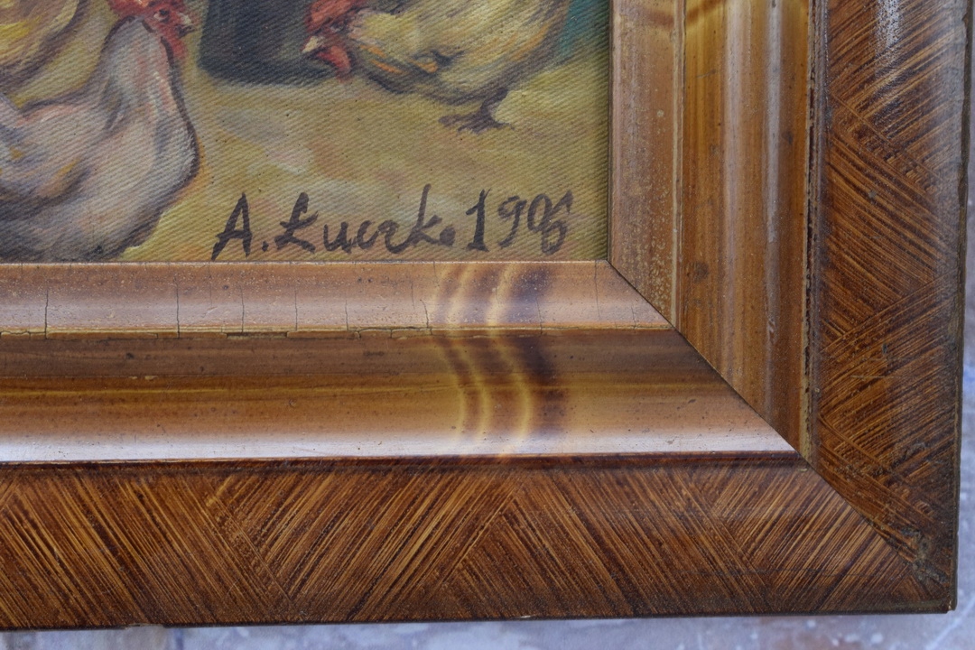 А. Лучко 1906 - Кури Півні Ферма Сільська Ферма - Стара красива картина маслом
