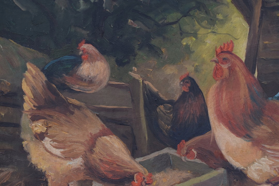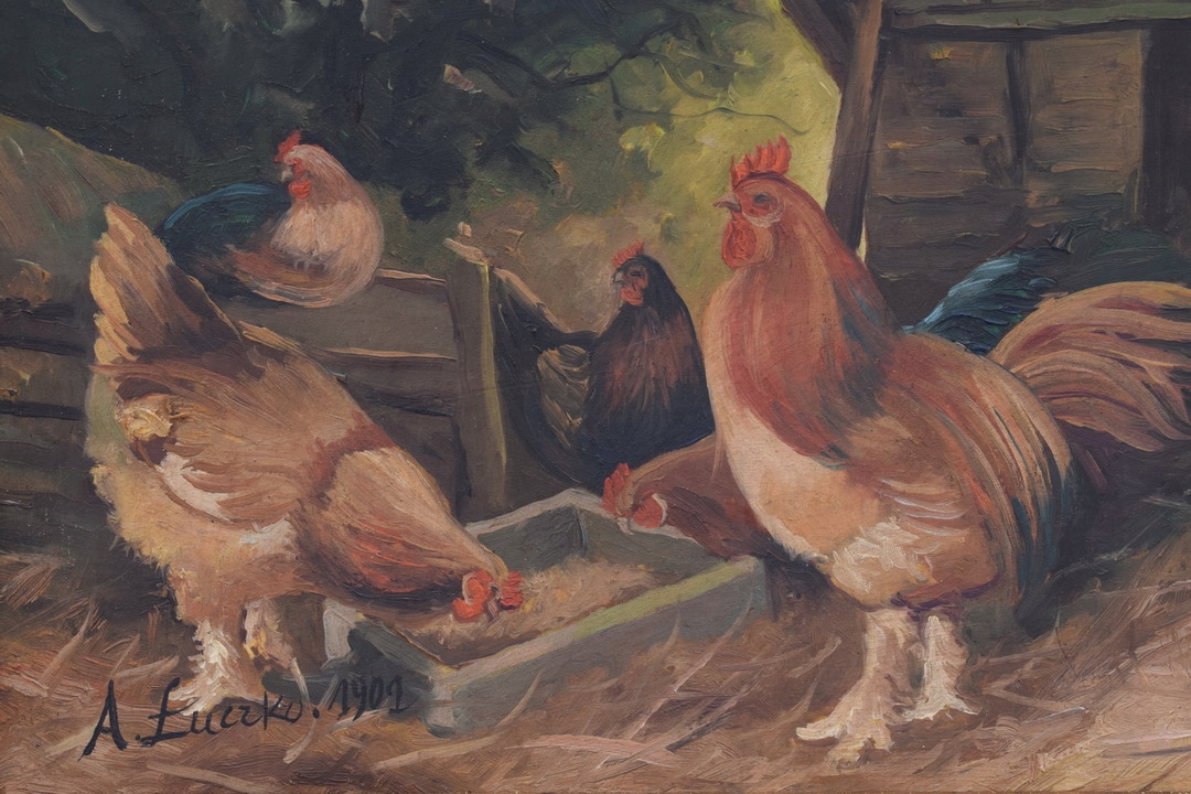 A. Łuczko 1901 - Кури Півні Ферма Сільська Ферма - Стара красива картина маслом