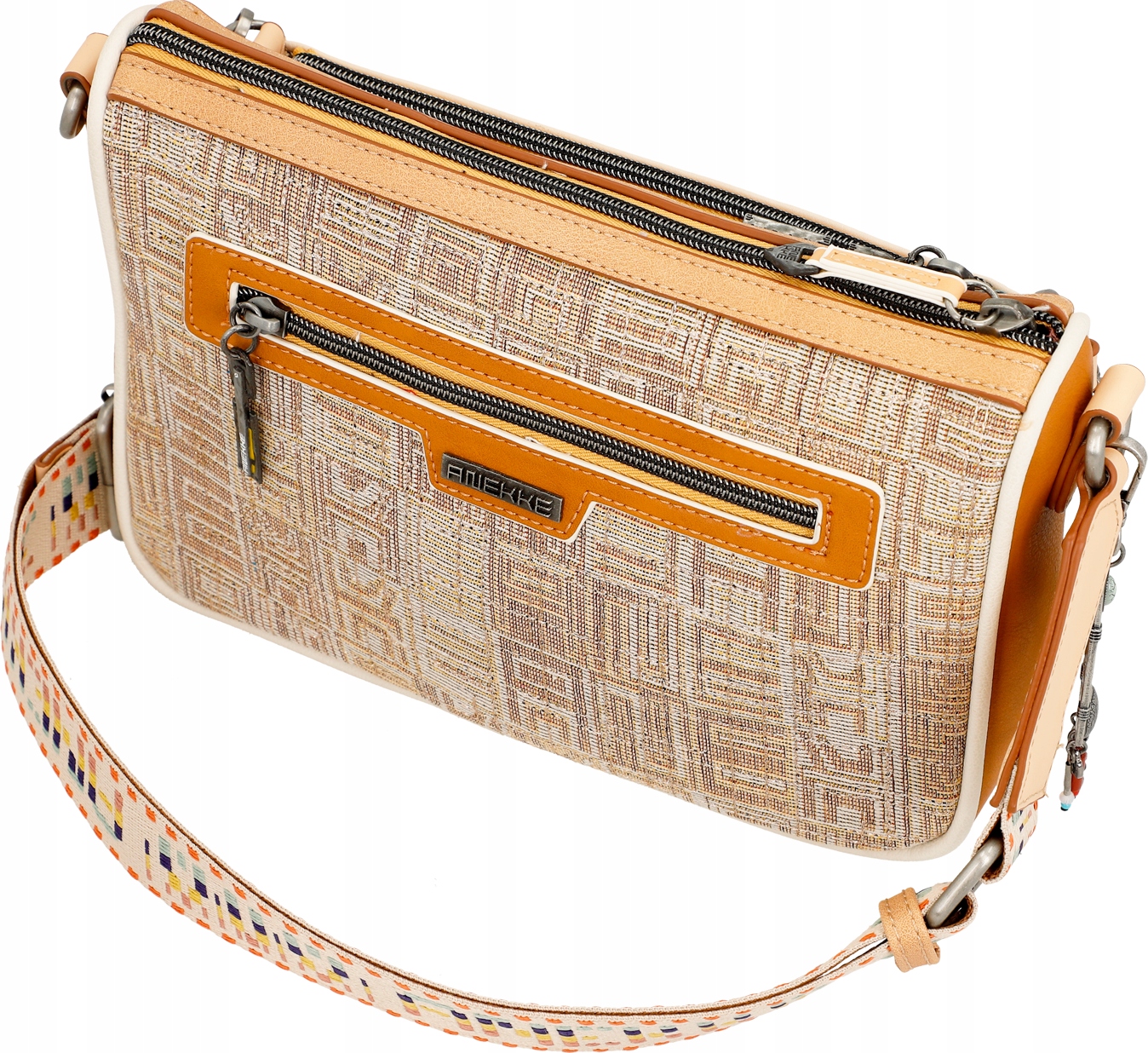 Сумка Anekke Menire Tribe це 2 сумки, з'єднані чотирма застібками. Обидві сумки Anekke можна носити разом, застібаючись на застібки, або кожну окремо, як сумку-месенджер або як офіційну сумку. Відділення більшої сумки містить три кишені - дві відкриті і одна закрита на блискавці. Сумка Anekke Menire Tribe оснащена додатковим плоским кишенею ззаду. Сумку Anekke можна носити на тканому, довгому, регульованому, постійно прикріпленому поясі. Сумка оснащена додатковим ременем на ланцюжку довжиною приблизно 50 см. Сумка Anekke Menire Tribe ідеально підходить для щоденного використання або для урочистих випадків, в неї легко помістяться телефон і ключі. , і ще кілька дрібниць.