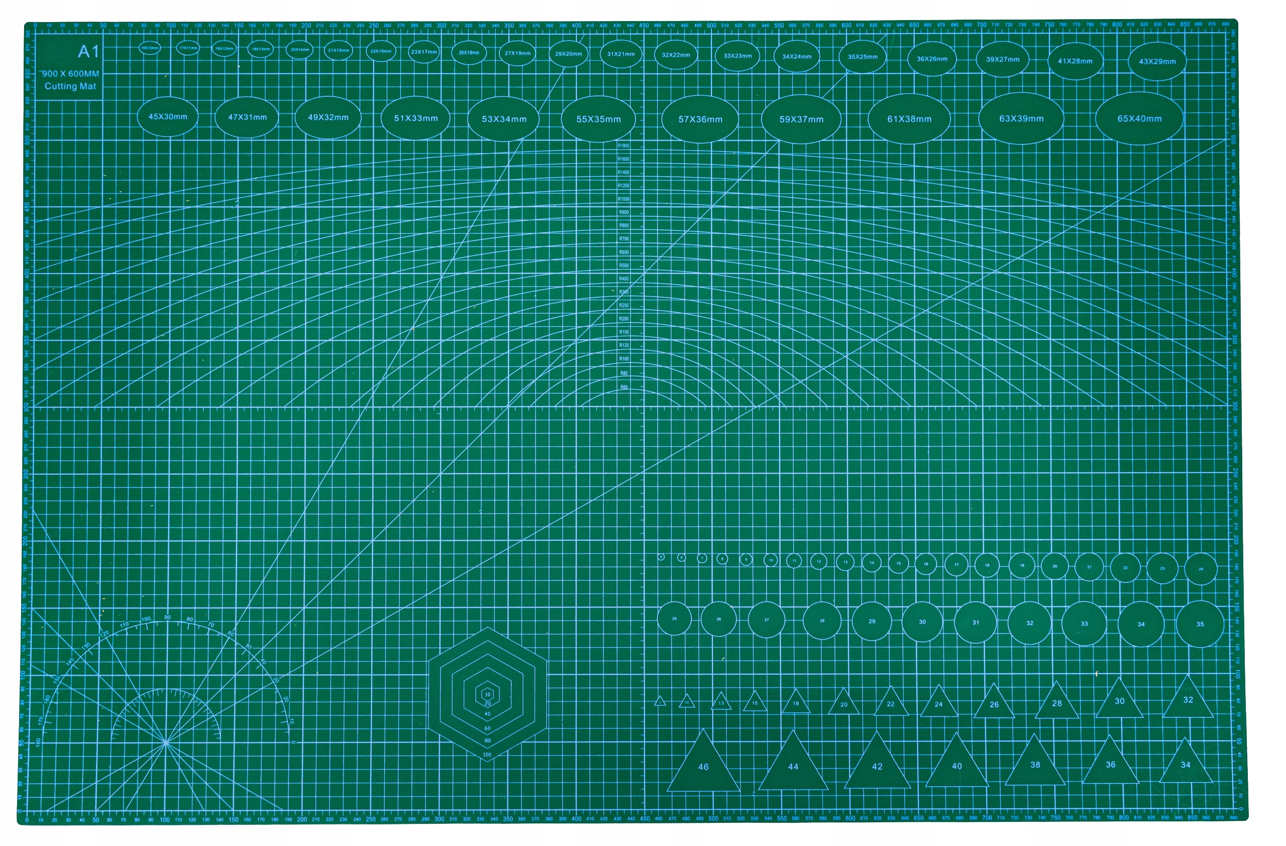 Килимок складається з кількох шарів, які гарантують належну міцність і жорсткість усього килимка. Зелені зовнішні шари з сіткою на них - вони полегшують роботу та точні вимірювання та різання. Додаткова допомога у вигляді позначених кутів і паралельних ліній дозволяє легко і швидко вирізати, не потребуючи використання додаткових інструментів - лінійок або транспортирів. Килимок можна вільно обертати, тому ви можете використовувати його довше.