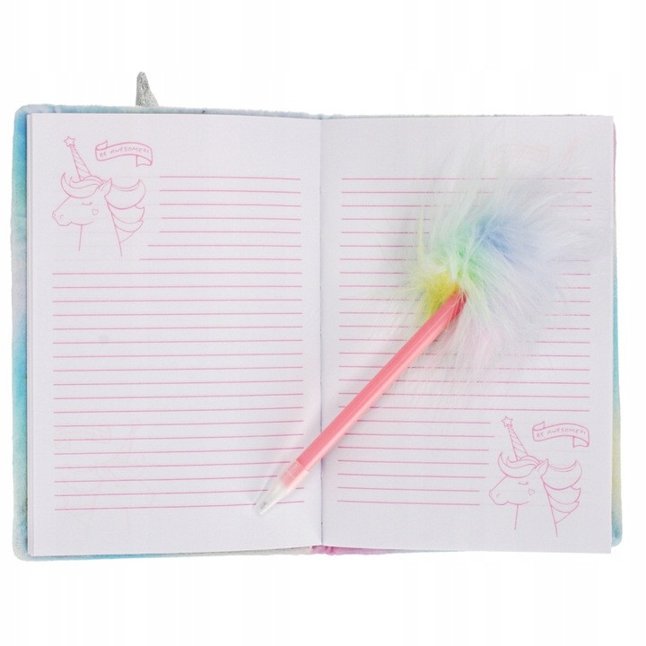 Ноутбук покритий приємним до сенсорної плюшевої та дружньої графіки з єдинорога, додатковим у наборі - це ручка з пухнастою накладкою, що робить цей прекрасний набір привабливішим.